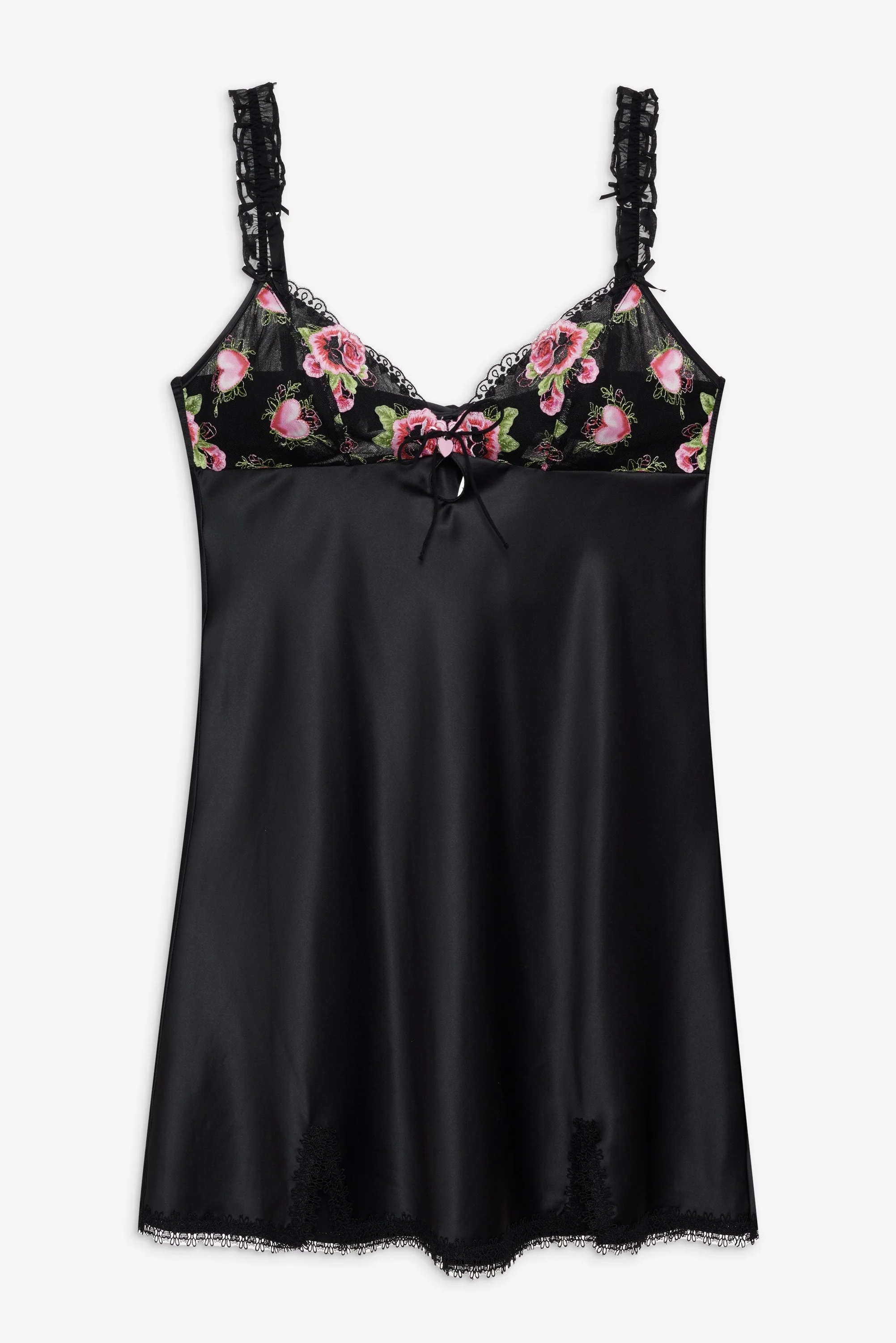 Chic and feminine, the Love Garden black slip dress exudes a sense of timeless romance. Featuring charming floral embroidered cups with lace trims and a satin skirt, this sexy negligee is adorned with an enamel heart charm and decorative skinny bows at center front and straps. Style Notes - Cup lining only - Satin tie at back bra - Adjustable shoulder straps Fabric + Care - Crafted in 97% polyester, 3% elastane - Lace is made of 100% recycled polyester - Embroidery is made of 100% polyester - Trim is made of 100% polyester - Hand wash cold - Do not wring or twist - Line dry - Do not iron - Do not dry clean