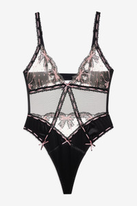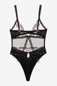 Both feminine and seductive—the Love Letters black bodysuit is crafted in satin and mesh, and features soft cups, a high-cut leg, and a sexy thong back. This teddy underwear is adorned with pretty embroidery, slotted ribbon lace trims, and skinny satin ribbon bows. Style Notes - Unlined - Decorative elastic - Adjustable shoulder straps - Functional tie and button closure at the center-back waist Fabric + Care - Crafted in 95% polyester, 5% elastane - Lace is made of 100% polyamide - Embroidery is made of 96% polyester, 4% other fiber - Mesh is made of 88% polyamide, 12% elastane - Trim is made of 80% polyamide, 20% polyester - Gusset is made of 100% modal - Hand wash cold - Only non-chlorine bleach - Do not wring or twist - Line dry - Do not iron - Do not dry clean