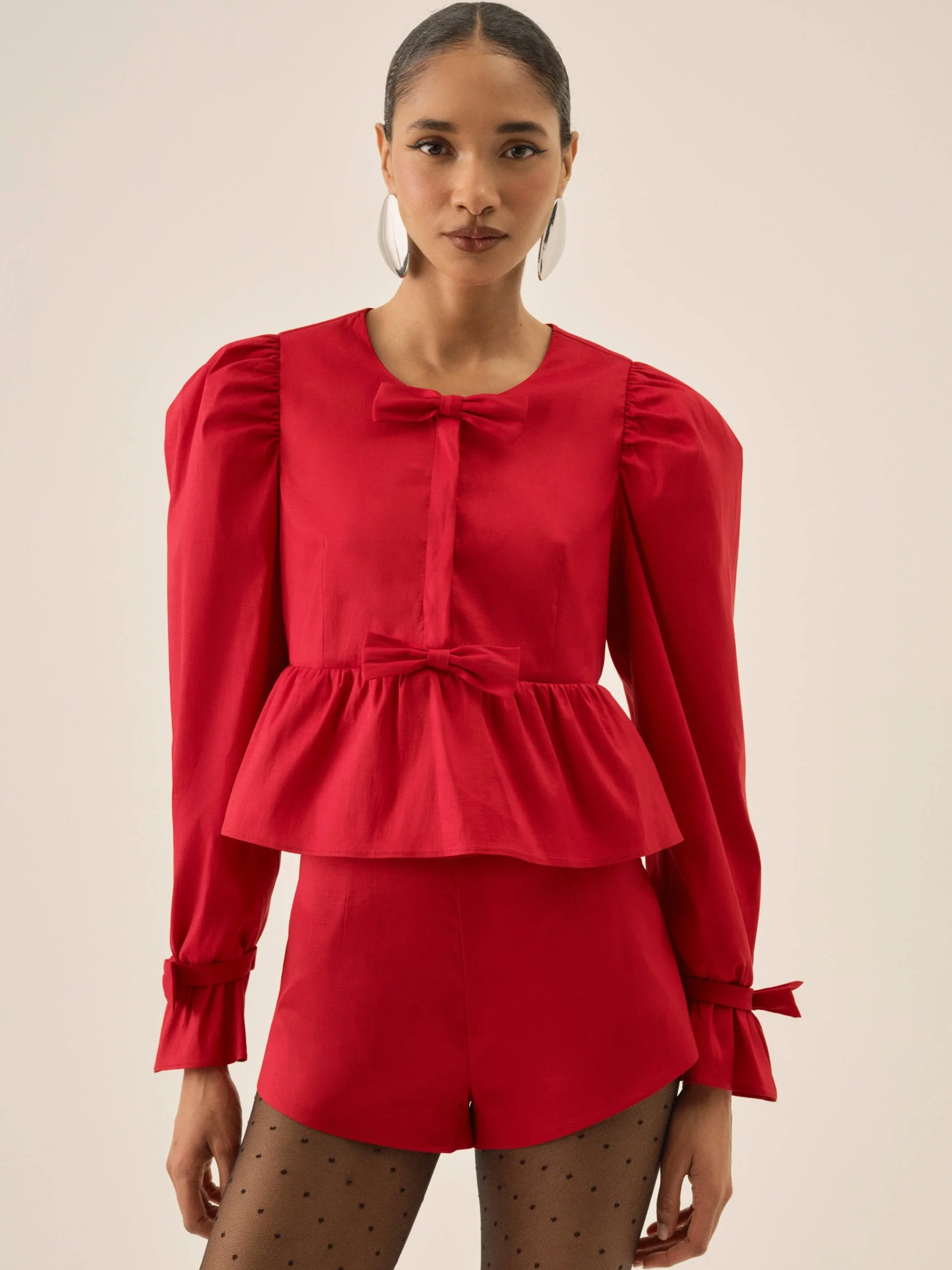 Get festive in the Lucia red top, crafted in crisp taffeta. This long sleeve top spotlights slight puff shoulders and is adorned with fixed bows at the hidden placket and wrists. Pair it with the Lucia Top for a holiday-ready co-ord set. Fit Notes - True to size Style Notes - Fully lined - Functional hidden placket Fabric + Care - Crafted in 64% polyester, 32% polyamide, 4% elastane - Lining is made of 100% polyester - Dry clean only