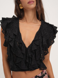 Designed for the ultimate romantic, the Lucianna black crop top exudes femininity with its tiered lace ruffles and plunging v-neckline. This cropped top is finished with a rib trim waistband for the perfect fit. Style Notes - Unlined - Small snap at neckline Fabric + Care - Crafted in 90% nylon, 10% spandex - Dry clean only