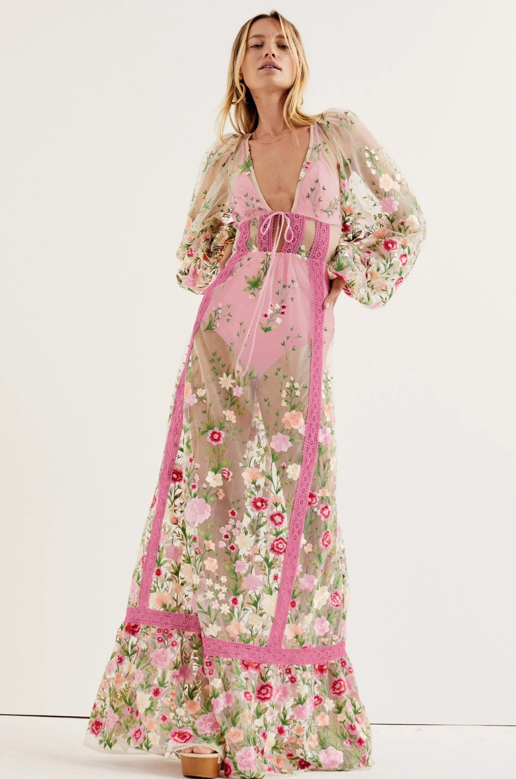 Spring garden engineered embroidery tulle maxi dress. Deep V neckline, billowy long sleeves, and lace trim throughout. Built-in bra and panty lining. Style Notes - Spring garden embroidery - Tulle fabric - Deep-V neckline - Billowy long sleeves - Lace trim through-out - Built-in bra & panty lining Fabric + CareFabric is an engineered embroidered tulle with little stretch. Lining is a recycled polyester stretch satin. Self: 100% Nylon. Lining: 97% Recycled Polyester 3% Spandex Dry Clean: When you are ready to dry clean, we suggest choosing an environmentally friendly dry cleaner to avoid the use of harsh chemicals like perchloroethylene or "perc."