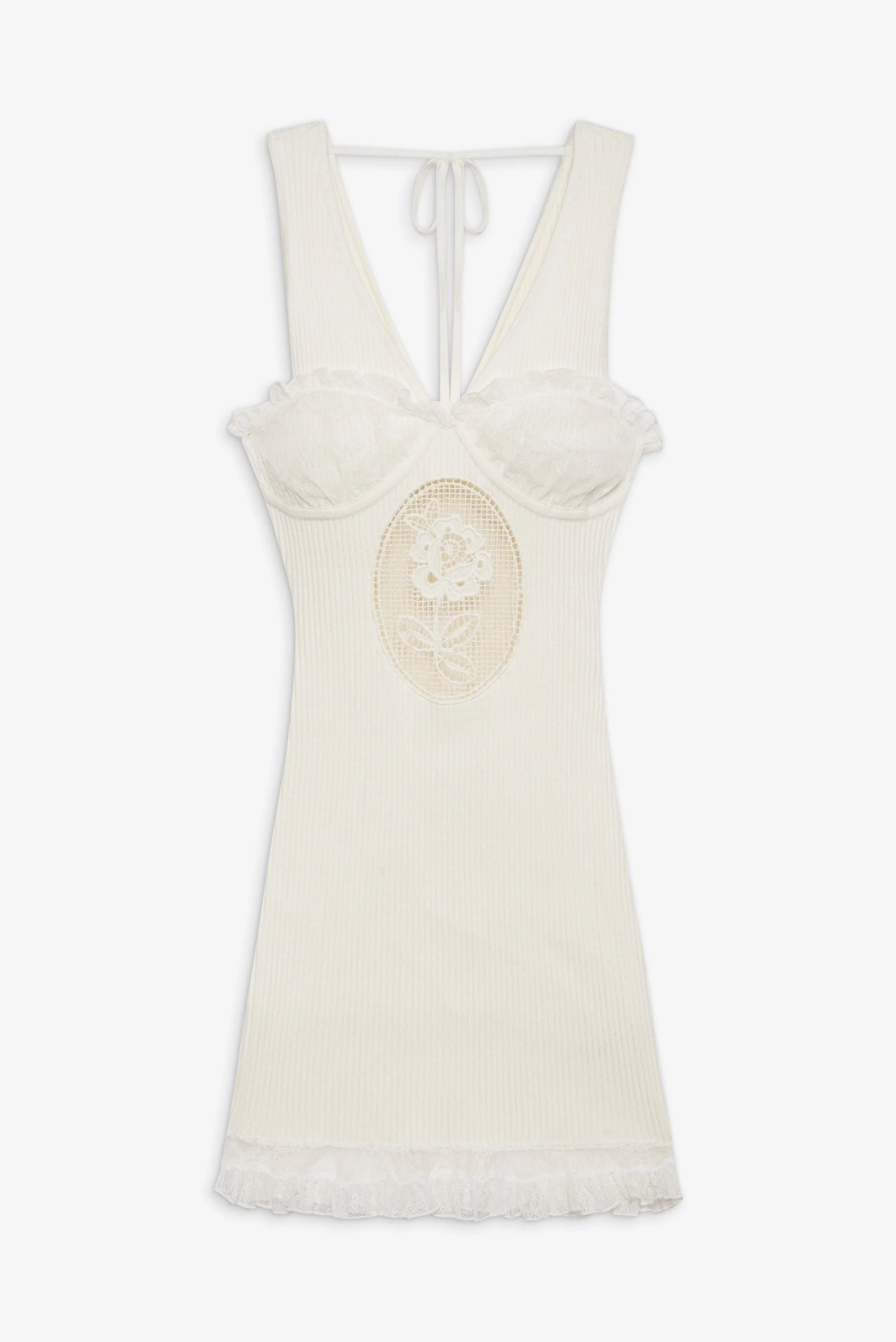 Inspired by vintage motifs, the Lyon white mini dress is crafted in a rib knit and features an inset rose cameo at the waist. This knit dress has a deep V neckline at the front and back and spotlights a feminine contrast lace ruched cup overlay at the bodice. Fit NotesThe Lyon Knit Mini Dress is designed to be fitted. We recommend taking your usual size. Style Notes - Unlined - Function tie at the back shoulders - Contrast ruffled lace panel along the bottom hem Fabric + Care - Crafted in 50% viscose, 28% nylon, 22% polyester - Contrast 1 is made of 92% nylon, 8% spandex - Contrast 2 is made of 100% polyester - Dry clean only