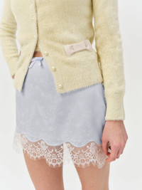 Exude a vintage aesthetic with the Madalie slip skirt—a high-waisted blue mini skirt crafted in a floral jacquard and adorned with inset lace trims and a decorative lingerie bow at the front waist. Style Notes - Fully lined - Invisible zipper at left side seam Fabric + Care - Crafted in 65% lyocell, 35% viscose - Dry clean only