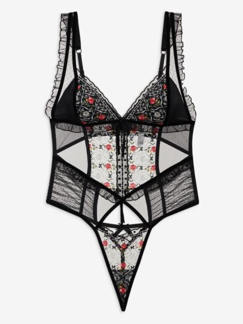 The Maia black thong bodysuit brings to life the magic of winter with its dazzling sequin cups that resemble the sparkles that shimmer across the ice. Featuring a plunging V-neckline with chiffon ruffles, this sexy teddy is finished with intricate lace detailing. Style Notes - Picot trim at leg - Functional tie at the center-back with button and loop closure Fabric + Care - Crafted in 94% polyester, 6% elastane - Lace is made of 93% polyamide, 7% elastane - Ruffles are made of 100% polyester - Lower Back Panel is made of 78% polyester, 22% elastane - Body Lining is made of 78% polyester, 22% elastane - Gusset Lining is made of 100% viscose - Hand wash cold, do not wring or twist - Line dry only