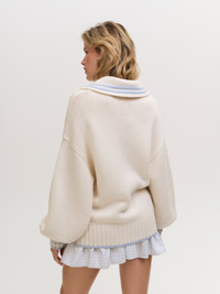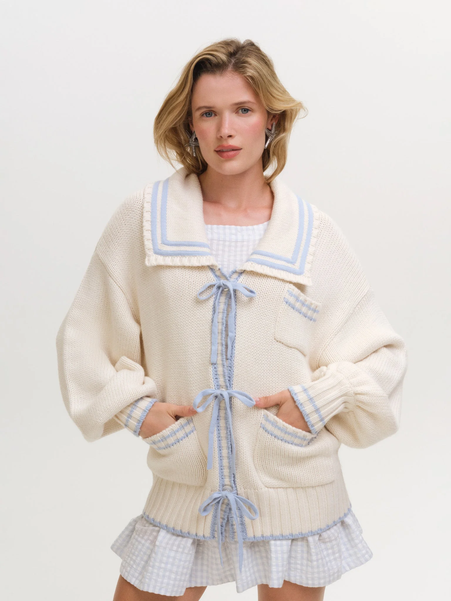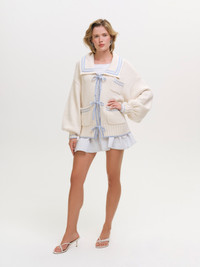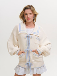 A soft and feminine spin on the sailor aesthetic, the Marina oversized cardigan is adorned with contrast knitted stripes, a classic square sailor collar, and patch pockets. Style Notes - Tie front closures Fabric + Care - Crafted in 48% nylon, 27% viscose, 20% wool, 5% cashmere - Dry clean only
