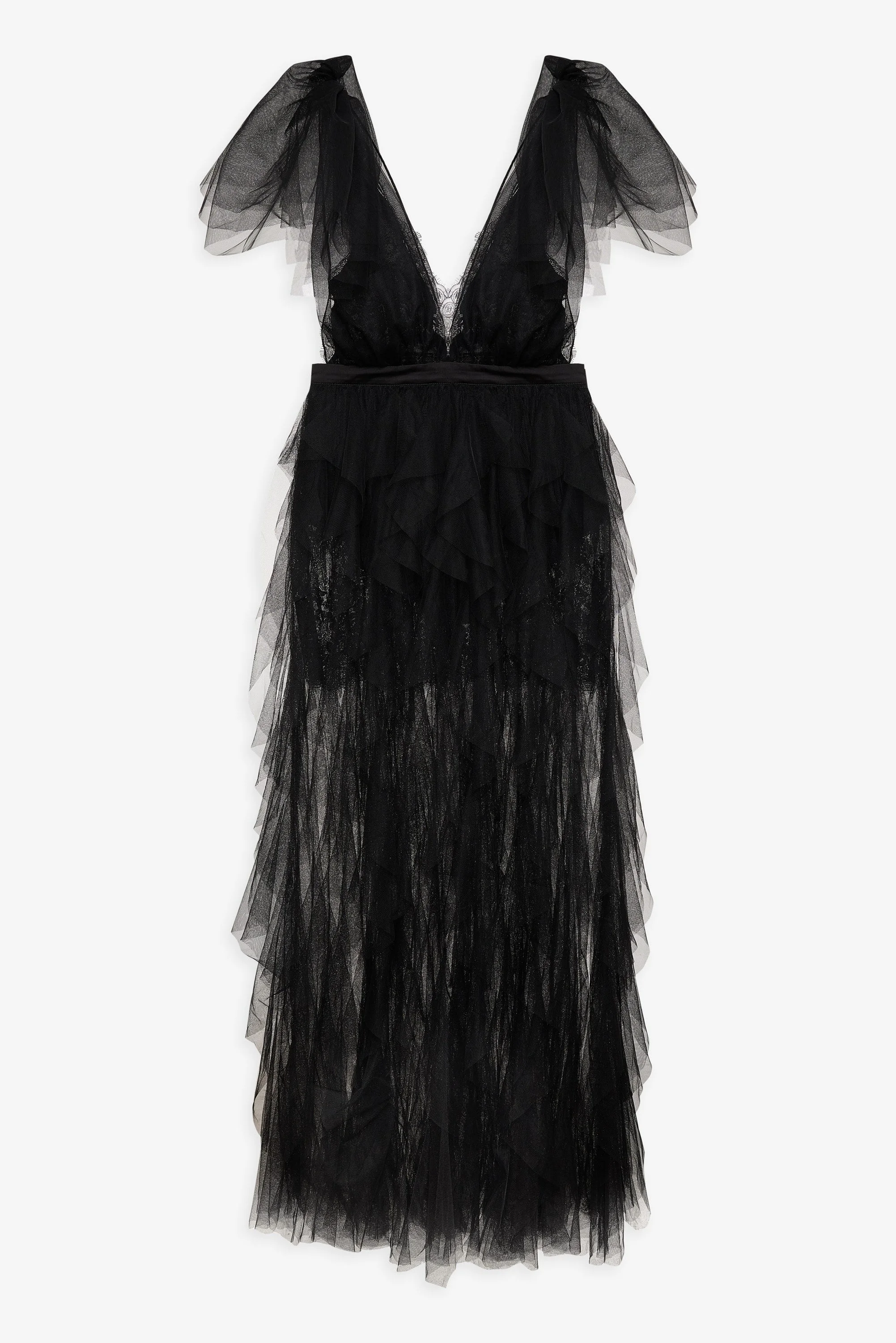 FOR LOVE & LEMONS KEEPSAKES: The Maxine black maxi dress is a true show-stopper. Crafted in a dramatic soft tulle, this evening gown spotlights an alluring plunge neckline, a low open back, and cascading gathered ruffle tulle atop a floral lace underlayer bodice and mini skirt. Style Notes - Cup lining only - Invisible zipper at center-back - Built-in satin panty lining with snaps at gusset Fabric + Care - Crafted in 100% recycled polyester - Contrast is made of 100% polyester - Lining 1 is made of 100% nylon - Lining 2 is made of 97% recycled polyester, 3% spandex - Dry clean only
