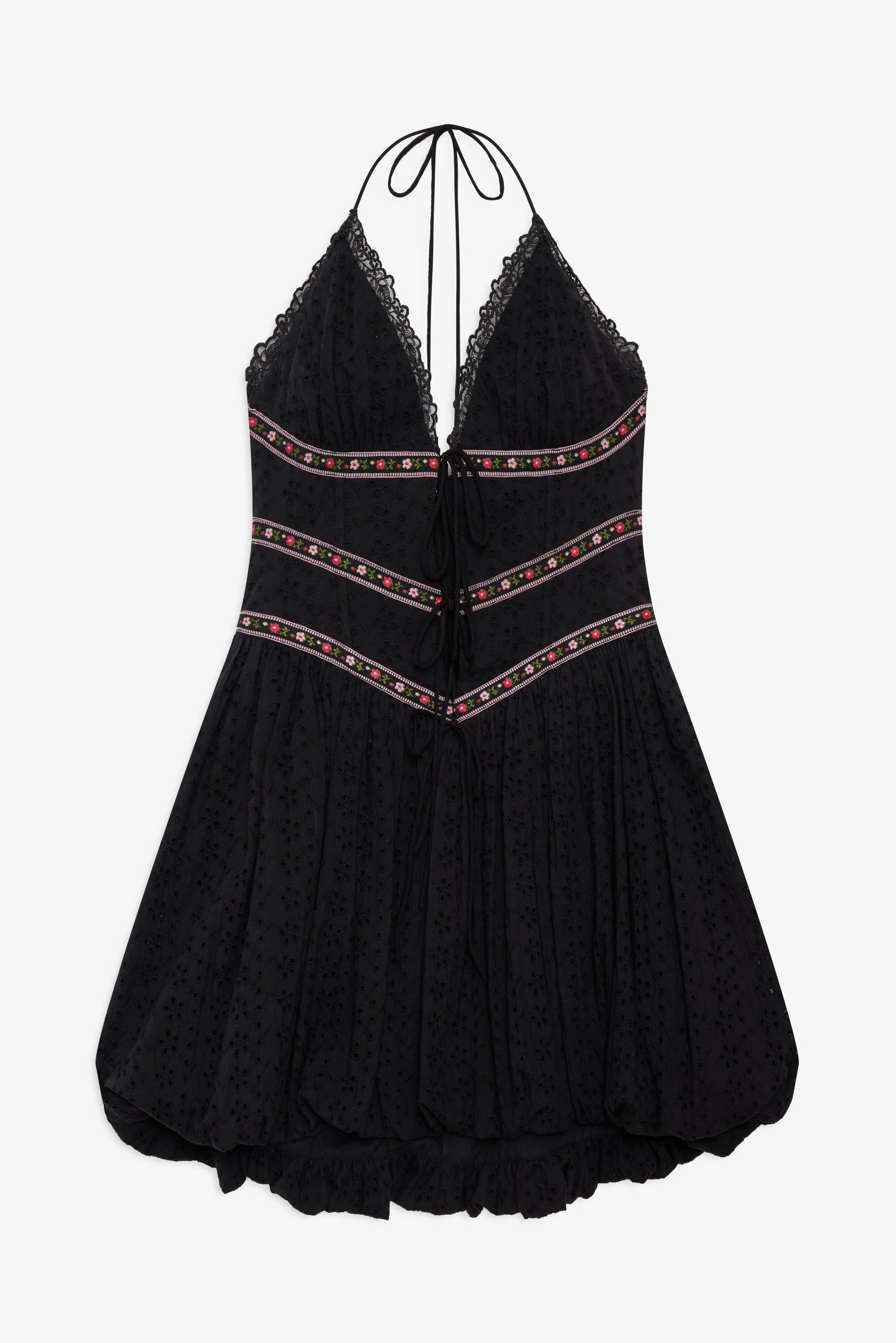 Update your go-to little black dress for fall with the McKinley black mini dress—a corset mini dress with boning at the sides and princess seams. Adorned with decorative jacquard ribbons, this halter mini dress features a plunging neckline, full gathered poplin skirt, and functional bows at center-front. Fit Notes - True to size Style Notes - Fully lined - Functional skinny tie halter straps Fabric + Care - Crafted in 100% cotton - Lining is made of 100% cotton - Machine wash cold gentle cycle - Lay flat to dry - Cool iron ok - Ok to dry clean