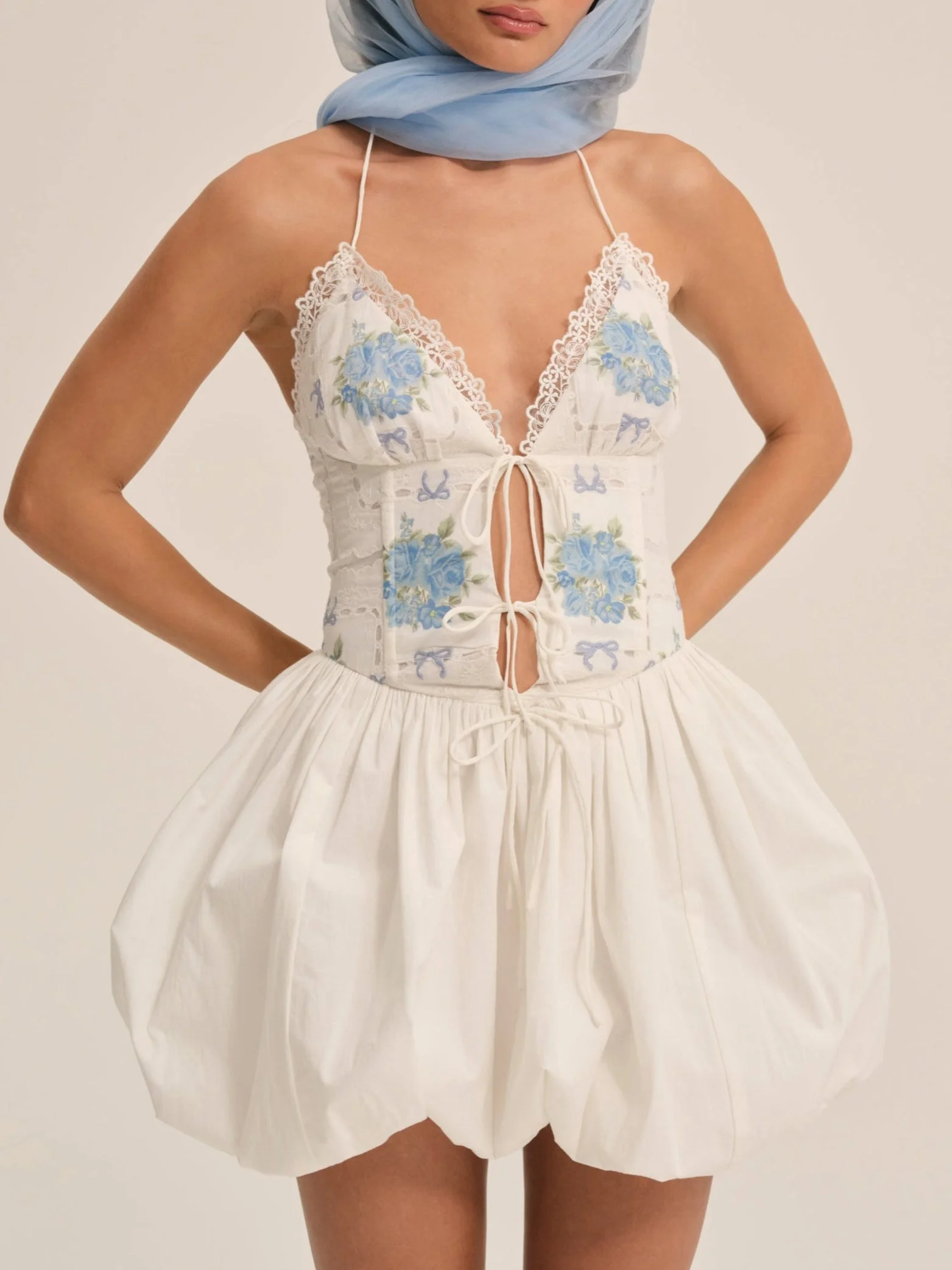 The McKinley white mini dress is the perfect floral dress for a summer by the water. Crafted in a cotton poplin and adorned with blue floral embroidery and lace trims, this mini dress with a puff skirt features a functional halter tying neckline, and boning at the side and princess seams.