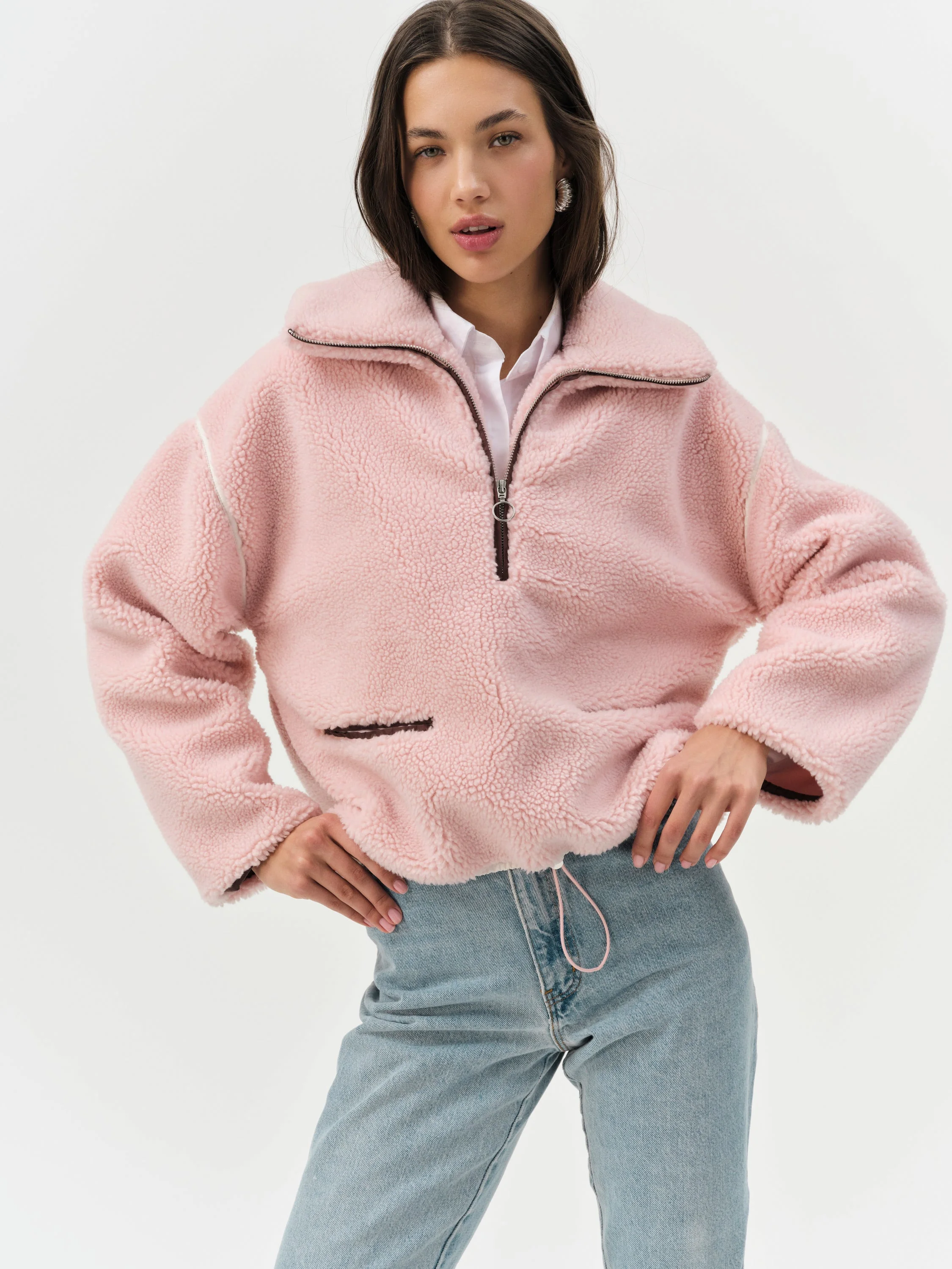 Embrace the cozy days ahead with the Melody pullover sherpa jacket—a pink fleece jacket cut to an oversized boxy fit with a functional half-zip detail, front welt pockets, and contrast brown and white bindings throughout. Style Notes - Fully lined Fabric + Care - Crafted in 73% polyester, 27% acrylic - Contrast 1 is made of 100% polyester - Contrast 2 is made of 100% polyester - Lining is made of 100% recycled polyester - Machine wash cold - Lay flat to dry - Do not bleach - Do not dry clean - Cool iron ok