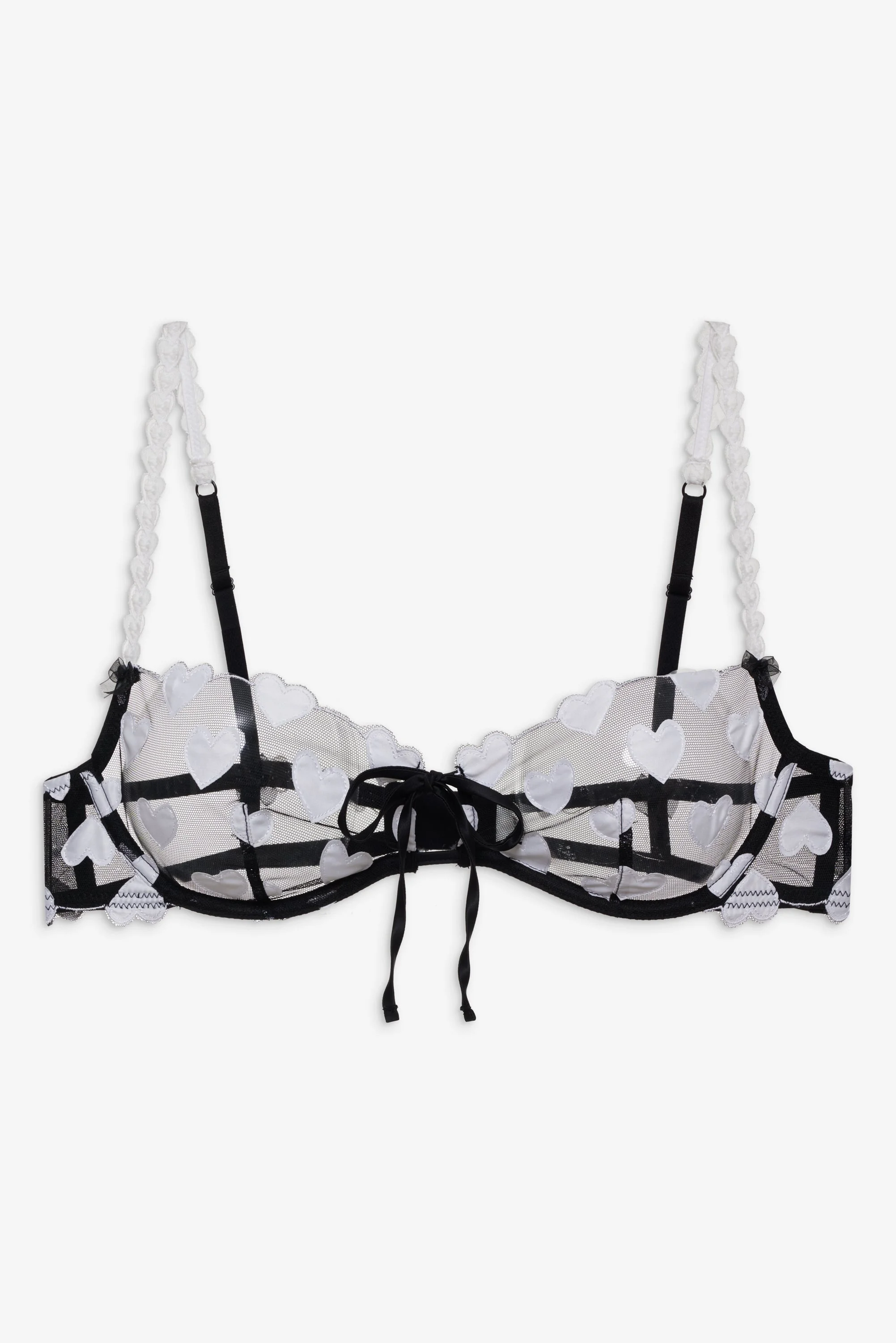 Become the queen of hearts in the Mia black underwire bra—featuring allover heart appliques. This sexy bra is decorated with an embroidery heart trim, organza bows, and a functional skinny tie at the center-front. Pair it with the Mia Thong Panty for a romantic lingerie set. Style Notes - Unlined - 3-row hook and eye tape - Adjustable shoulder straps Fabric + Care - Crafted in 100% polyester - Lining is made of 100% polyester - Hand wash cold, do not wring or twist - Line dry only