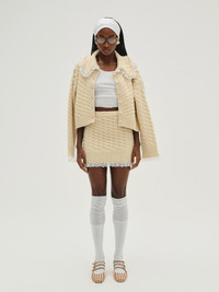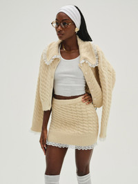 For a look that's both cozy and elegant, get to know the Milana cream mini skirt—a high-waisted cable knit skirt with a pretty lace trim at the hem. Pair it with the Milana Cardigan for a co-ord skirt set. Fit NotesThe Milana Mini Skirt is designed for a bodycon fit. We recommend taking your usual size. Style Notes - Unlined - Rib trims at the waist and hem Fabric + Care - Crafted in 77% acrylic, 9% nylon, 8% wool, 6% polyester - Dry clean only