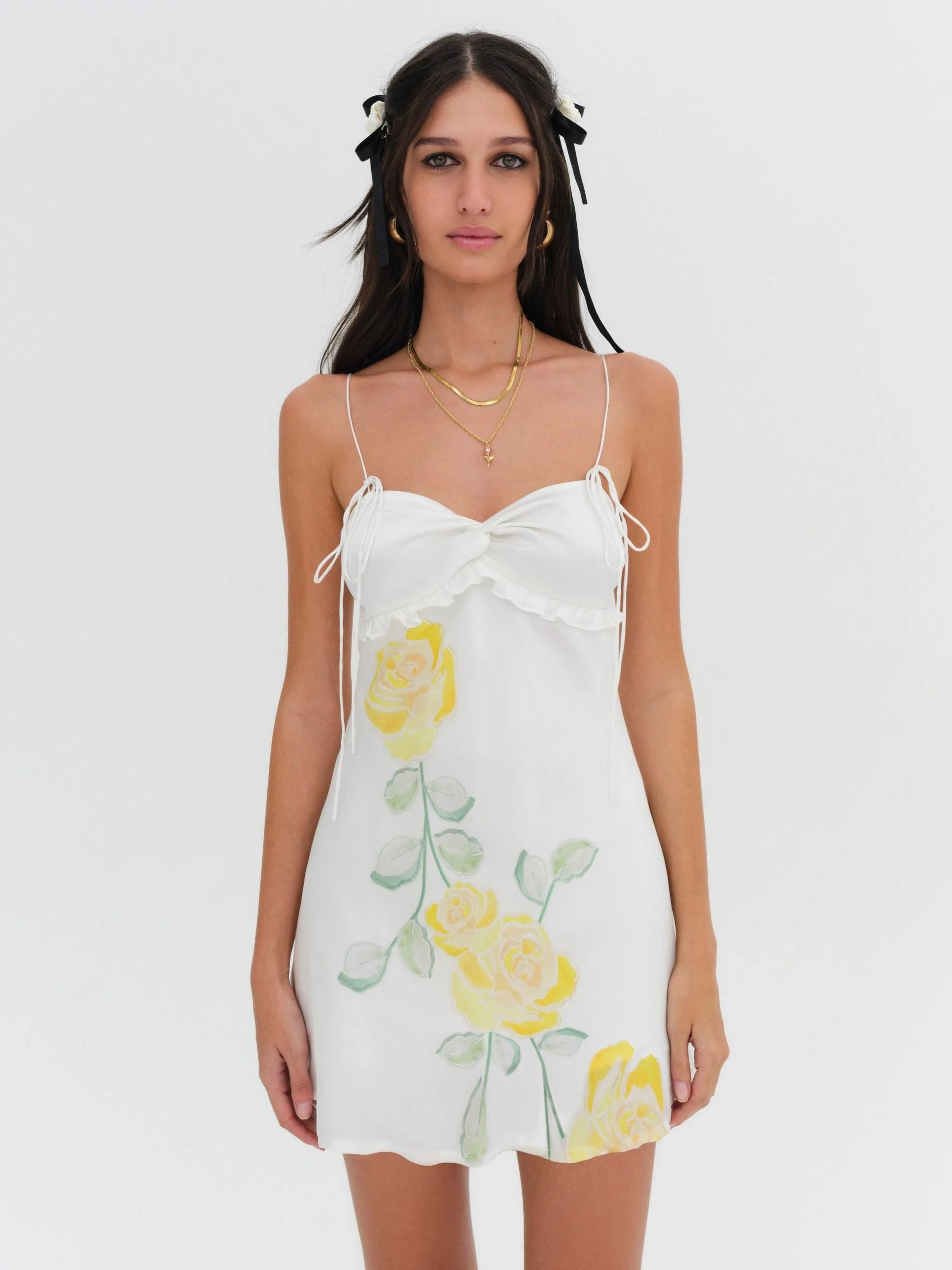 Designed for sun soaked days and the warmest golden hours, the Millie yellow mini dress is crafted in a silky satin and features oversized watercolor roses that echo the ripples of summer tides. This short slip dress has a ruched twist-front bodice and slightly flared skirt for a flattering, wear-everywhere fit. Fit NotesThe Millie Mini Dress is designed for a slightly relaxed fit. We suggest taking your usual size. Style Notes - Lined at bodice - Functional skinny tie shoulder straps - Keyhole with functional button at the center-back Fabric + Care - Crafted in 98% viscose, 2% spandex - Lining is made of 100% polyester - Eco dry clean is recommended to avoid harmful chemicals like "perc"