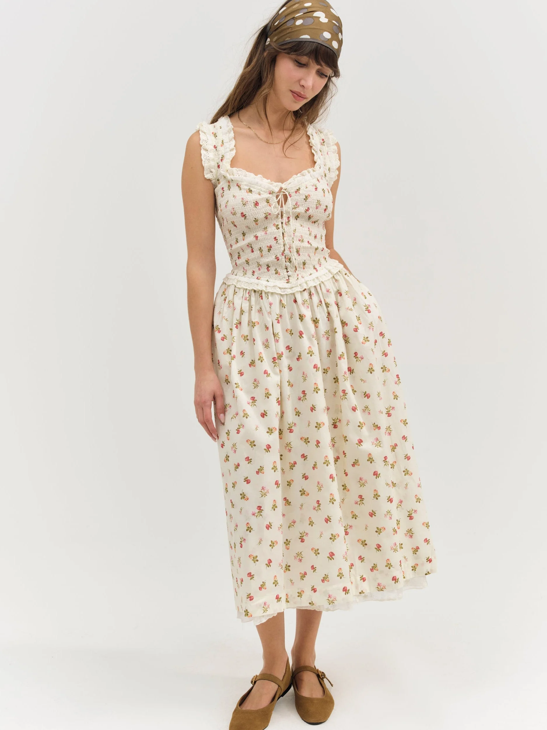 With its charming vintage-inspired silhouette, the Morgan cream midi dress is the perfect piece to bridge the seasons beautifully. Featuring an ultra-flattering smocked bodice—this floral dress has a feminine gathered skirt and is adorned with ruffled eyelet trim. Style Notes - Lined skirt - Functional button front - Pockets at side seams Fabric + Care - Crafted in 100% cotton - Lining is made of 100% cotton - Dry clean only