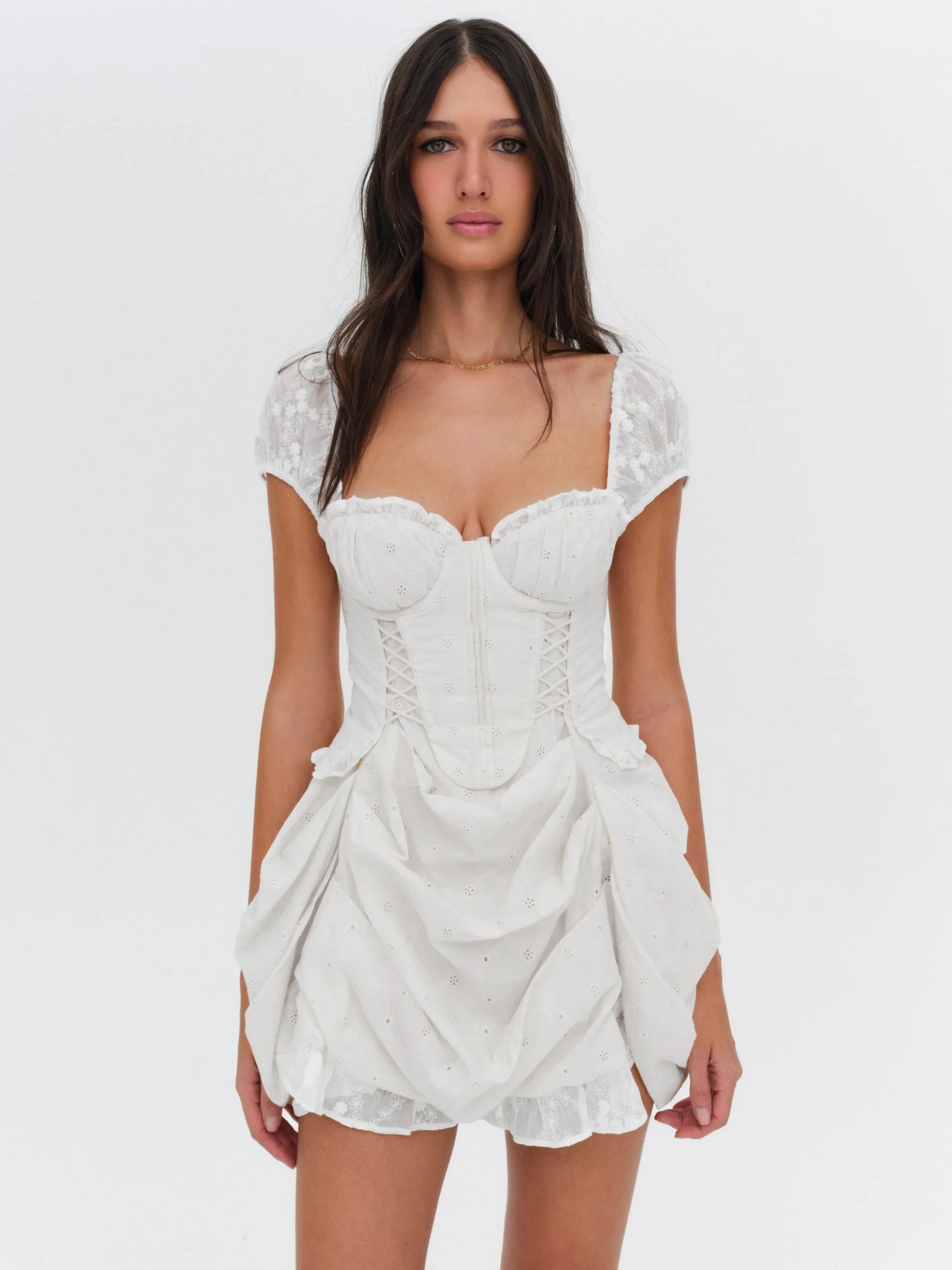 Cut to an antique-inspired silhouette, the Morgan white mini dress was made for the vintage-loving Muse. Featuring gathered underwire cups and a corset overlay, this cotton eyelet dress exudes femininity with its embroidered puff sleeves and elegant draping at the skirt. Style Notes - Fully lined - Invisible zipper at the center-back - Functional and adjustable corset overlay Fabric + Care - Crafted in 100% cotton - Lining is made of 100% cotton - Dry clean only