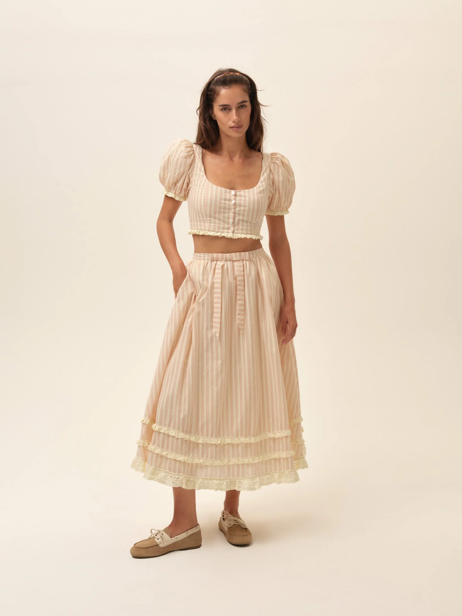 A red striped crop top with a scooped neckline, puff sleeves, and crochet lace trim, fitted throughout for a flattering, vintage-inspired feel. Complete the look with the Style Notes - Wide scoop neckline - Functional button placket at center front - Decorative crochet lace trims - Elasticized puff sleeves - Fitted bodice with princess seams - Fully lined Fabric + Care - Crafted in 80% cotton, 20% nylon - Lining is made of 100% cotton - Dry clean only