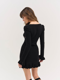 Crafted in 100% cotton, the Naomi Knit black mini dress is a chic transitional piece for the cooler seasons ahead. This long sleeve mini dress spotlights a deep “v” neckline, long fitted sleeves, shirring at underbust, and adorned with a velvet tie at center neckline, decorative jacquard ribbons, ruffles throughout. Fit Notes - True to size Style Notes - Functional velvet tie at center - Shirring along the cup at under-bust Fabric + Care - Crafted in 100% cotton - Dry clean only