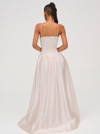 FOR LOVE & LEMONS KEEPSAKES: Designed for the Muse who indulges in the romantic, the Nara pink maxi dress captivates and charms. This evening gown is crafted in 100% silk stretch satin and features an ultra-flattering drop waist corset bodice, dramatic gathered flared skirt, and is adorned with floral appliques at the cups. Style Notes - Bodice lining only - Invisible zipper at center-back - Satin cup insert to slip behind tulle cups - Internal bra band with hook & eye closure Fabric + Care - Crafted in 100% silk - Contrast is made of 100% recycled polyester - Lining 1 is made of 98% recycled polyester, 2% spandex - Lining 2 is made of 100% recycled polyester - Dry clean only