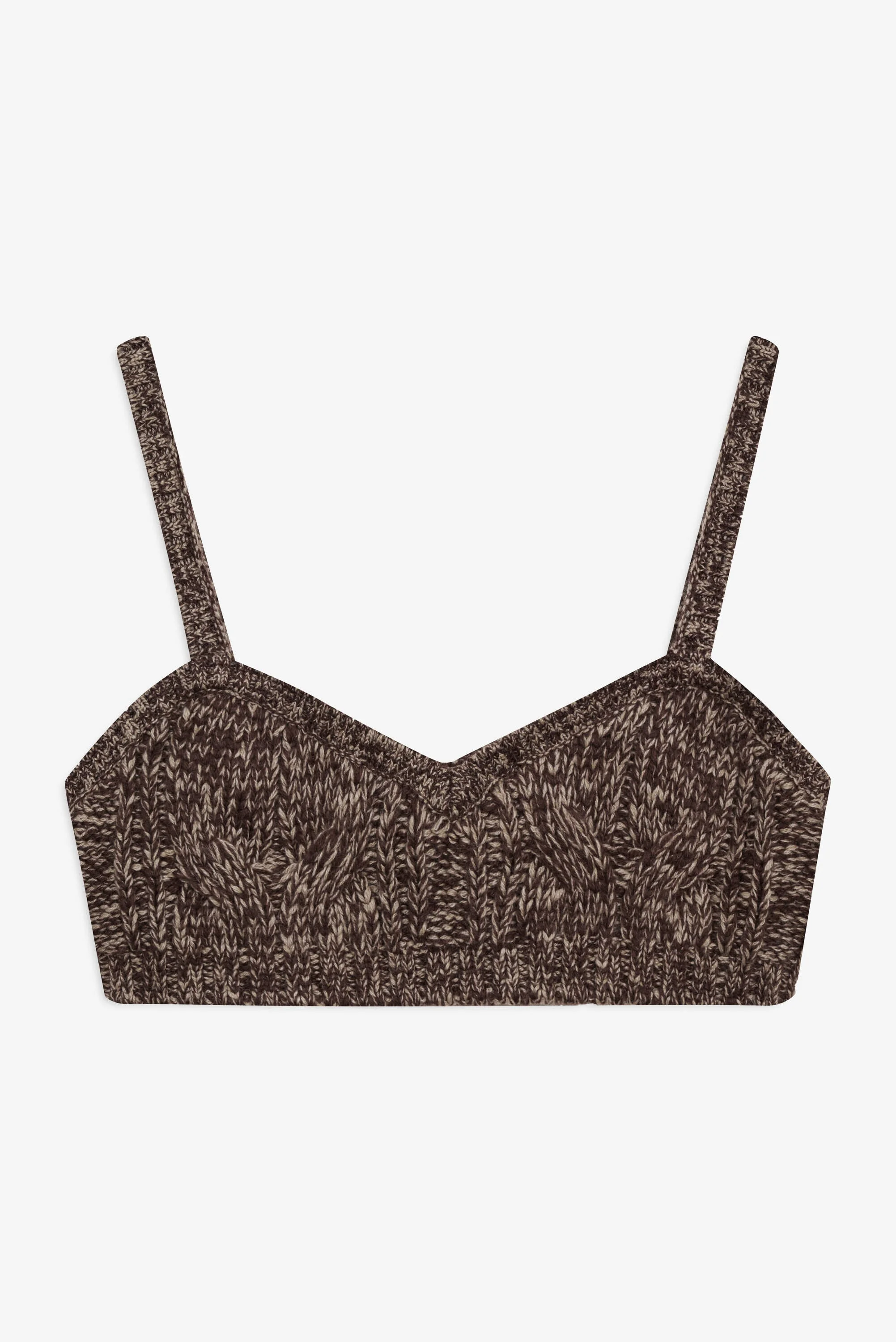 Embrace your soft side with the Nathalie Knit bra top, perfect for your soft afternoon wardrobe. Crafted in a cozy cable knit, this brown bralette is pull-on style and features a “v” neckline. Fit Notes - True to size Style Notes - Non-adjustable shoulder straps - Pull-on style Fabric + Care - Crafted in 48% nylon, 27% viscose, 20% wool, 5% cashmere - Dry clean only