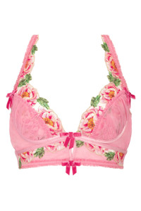 Everything's coming up roses. Blooming with lush embroidery, velvet bows, and airy chiffon, this one is a fresh pick. Style Notes - Underwire - Unlined - Double adjustable straps - Back hook and eye closures - Details & Fabric - Cage back - Gathered chiffon at cups side panels - Ruffled elastic - Partially made with recycled materials - Imported Fabric + CareSelf: 92% Recycled Polyester/ 8% Metallic; Contrast: 100% Polyester Machine Wash Cold Tumble Dry Low