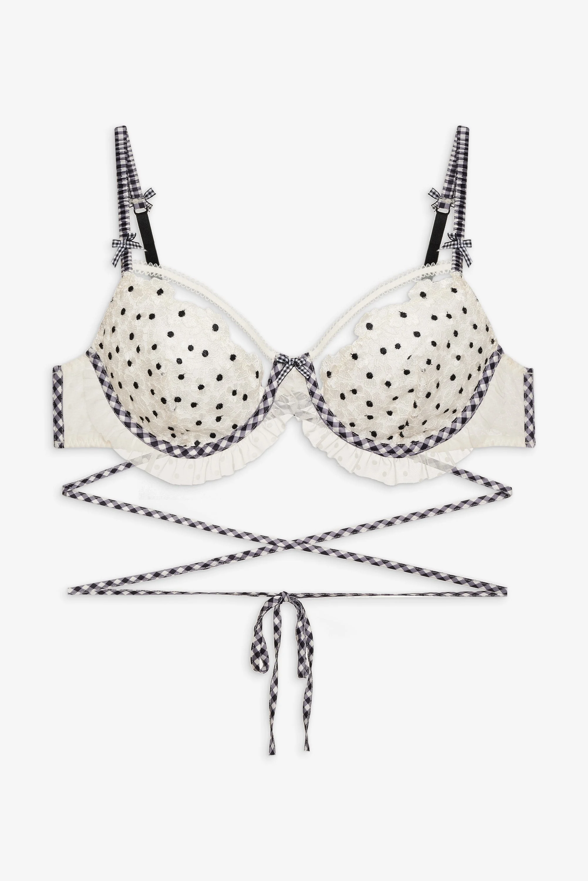 For muses who love romance—and flowers—the Odette white underwire bra is infused with both. Crafted in beautiful embroidered lace, this floral bra features a picot trim across the chest, ruffles at the underbust, and a contrast gingham tie that wraps around the waist for a playful finish. Style Notes - Shallow cups with underwire - Function wrap tie at the waist - Bra clasp closure at the center-back Fabric + Care - Crafted in 100% polyester - Wings are made of 82% polyamide, 18% elastane - Cup lining is made of 100% polyester - Cold hand wash only, line dry - Do not wring or twist, iron, or dry clean