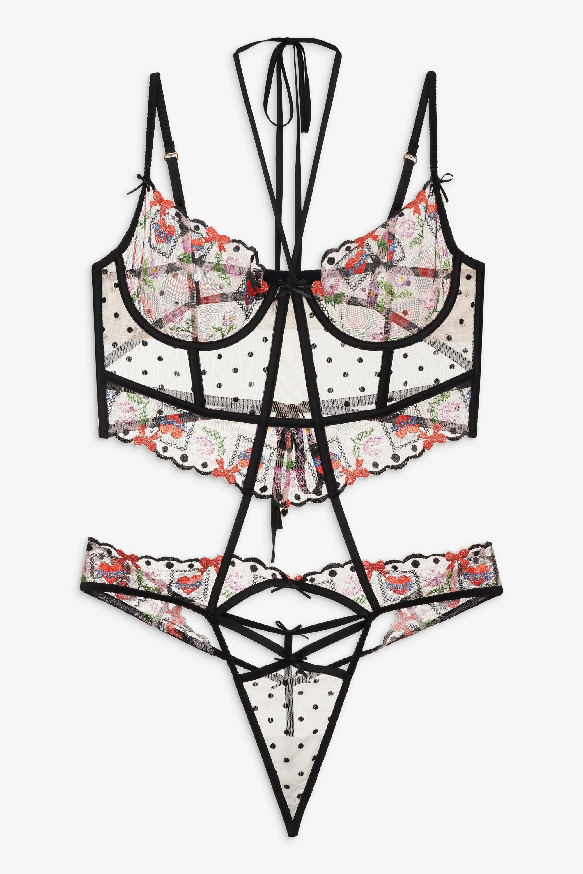 Crafted with intricate bow, heart, and floral patchwork embroidery, the Paris red teddy lingerie is both sexy and whimsical. Featuring underwire cups and a g-string back, this lingerie bodysuit is finished with contrast dot mesh panels, skinny ribbon bows, and an enamel heart charm.