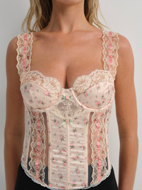 Blurring the lines between lingerie and daywear, the Peaches & Cream bustier top is designed to be worn in and out. Crafted in a vintage-inspired floral print, this corset top is fully boned and features underwire cups, organza eyelet lace trims with ribbon, and rosettes throughout. Style Notes - Unlined - Adjustable shoulder straps - Functional lace-up back Fabric + Care - Crafted in 96% recycled polyester, 4% elastane - Center front is made of 100% polyamide - Hem is made of 100% polyamide - Side wing lining is made of 100% polyester - Hand wash cold - Only non-chlorine bleach - Do not wring or twist - Line dry - Do not iron - Do not dry clean