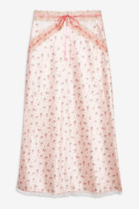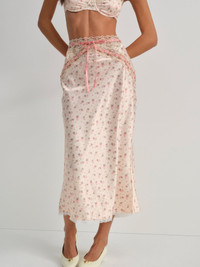 Designed to blur the lines between lingerie and daywear, the Peaches & Cream satin slip skirt is made to be worn in and out. Crafted in a vintage-inspired floral print with lace trims and slotted ribbon, this floral midi skirt is cut on the bias for a flattering fit. Pair it with the Peaches & Cream Underwire Bra or Bustier for a matching set. Style Notes - Unlined - Invisible zipper at side seam Fabric + Care - Crafted in 96% recycled polyester, 4% elastane - Side is made of 100% polyamide - Hand wash cold - Only non-chlorine bleach - Do not wring or twist - Line dry - Do not iron - Do not dry clean