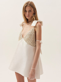 Designed to stand apart, the Pearly Bow white satin mini dress blends a sculptural shape with intricate pearl embellishment for a striking bridal mini dress silhouette. Finished with bow details and sheer tulle gloves, it’s an editorial take on bridal elegance. Style Notes - Beaded pearl bust panels - Bow at shoulders and back - Adjustable straps - Comes with tulle bow gloves - Invisible zipper - Lined Fabric + Care - Crafted in 100% polyester - Contrast 2 is made of 50% polyester, 46% nylon, 4% spandex - Lining is made of 100% polyester - Dry clean only