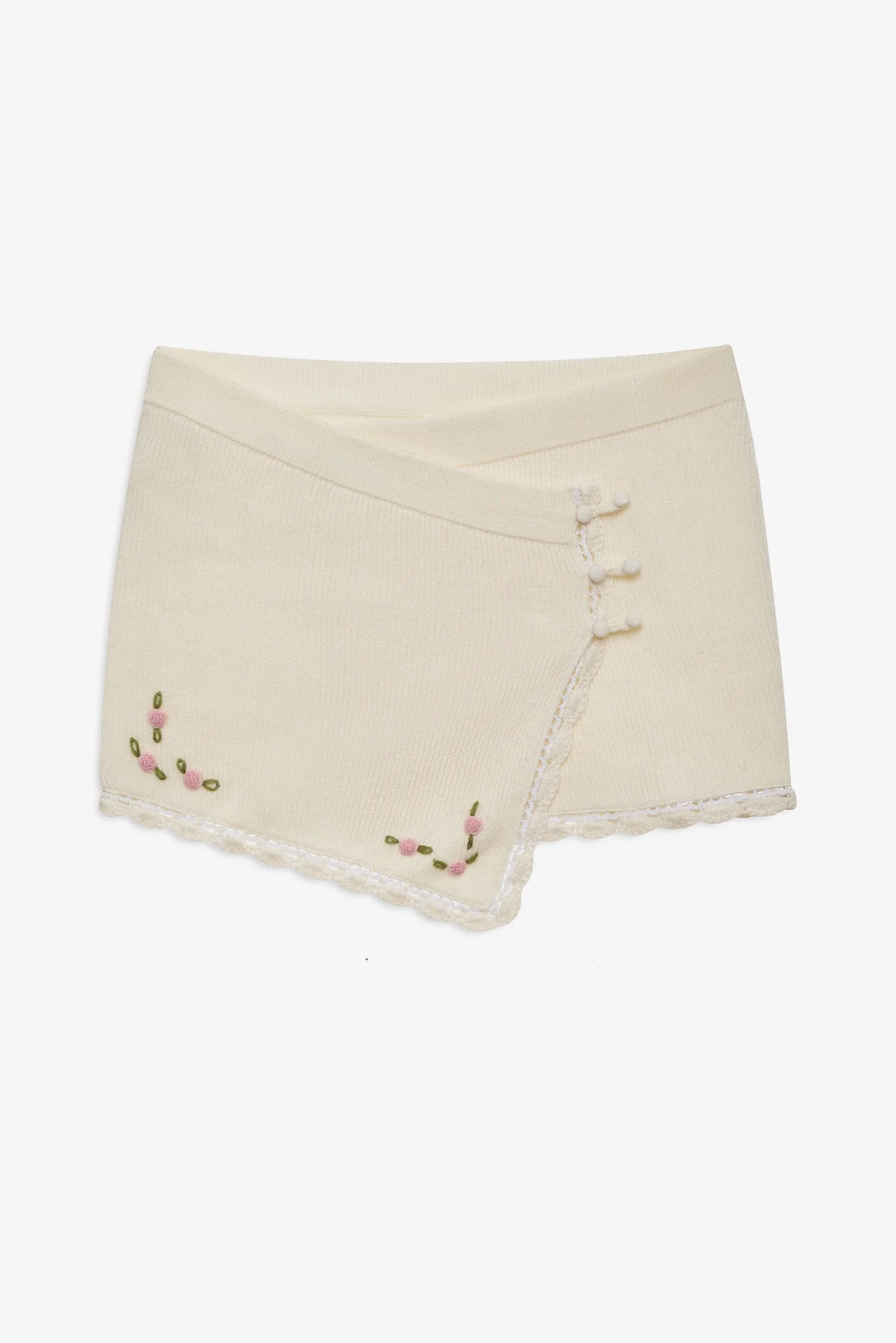 Designed for soft moments at home, the Phoebe knit mini skirt was made for the romantic Muse. This white mini skirt is crafted in an asymmetrical silhouette and is adorned with floral embroidery and scalloped trims throughout. Pair it with the Style Notes - Unlined - Decorative closure at fabric overlap Fabric + Care - Crafted in 48% nylon, 27% viscose, 20% wool, 5% cashmere - Dry clean only