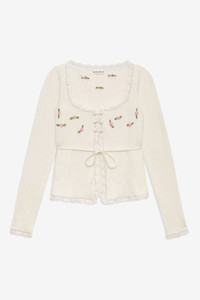 Designed for soft moments at home, the Phoebe white knit top was made for the romantic Muse. This long sleeve knit top features a squared neckline with a decorative closure at the bust and it's adorned with floral embroidery and scalloped trims throughout. Pair it with the Style Notes - Unlined - Functional back waist tie Fabric + Care - Crafted in 48% nylon, 27% viscose, 20% wool, 5% cashmere - Dry clean only