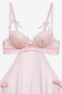 Designed for a romantic summer, the Peekaboo pink slip dress exudes femininity with soft embroidered underwire cups, waist cut-outs, and an open low back. Wear this lingerie slip from barefoot mornings to balmy nights. Style Notes - Lined cups - Adjustable ties - Bra clasp closure at the center-back Fabric + Care - Crafted in 60% polyester, 33% recycled polyester, 7% elastane - Cup is made of 100% recycled polyester - Embroidery is made of 100% polyester - Cup lining is made of polyester - Hand wash cold - Only non-chlorine bleach - Do not wring or twist - Line dry - Do not iron - Do not dry clean