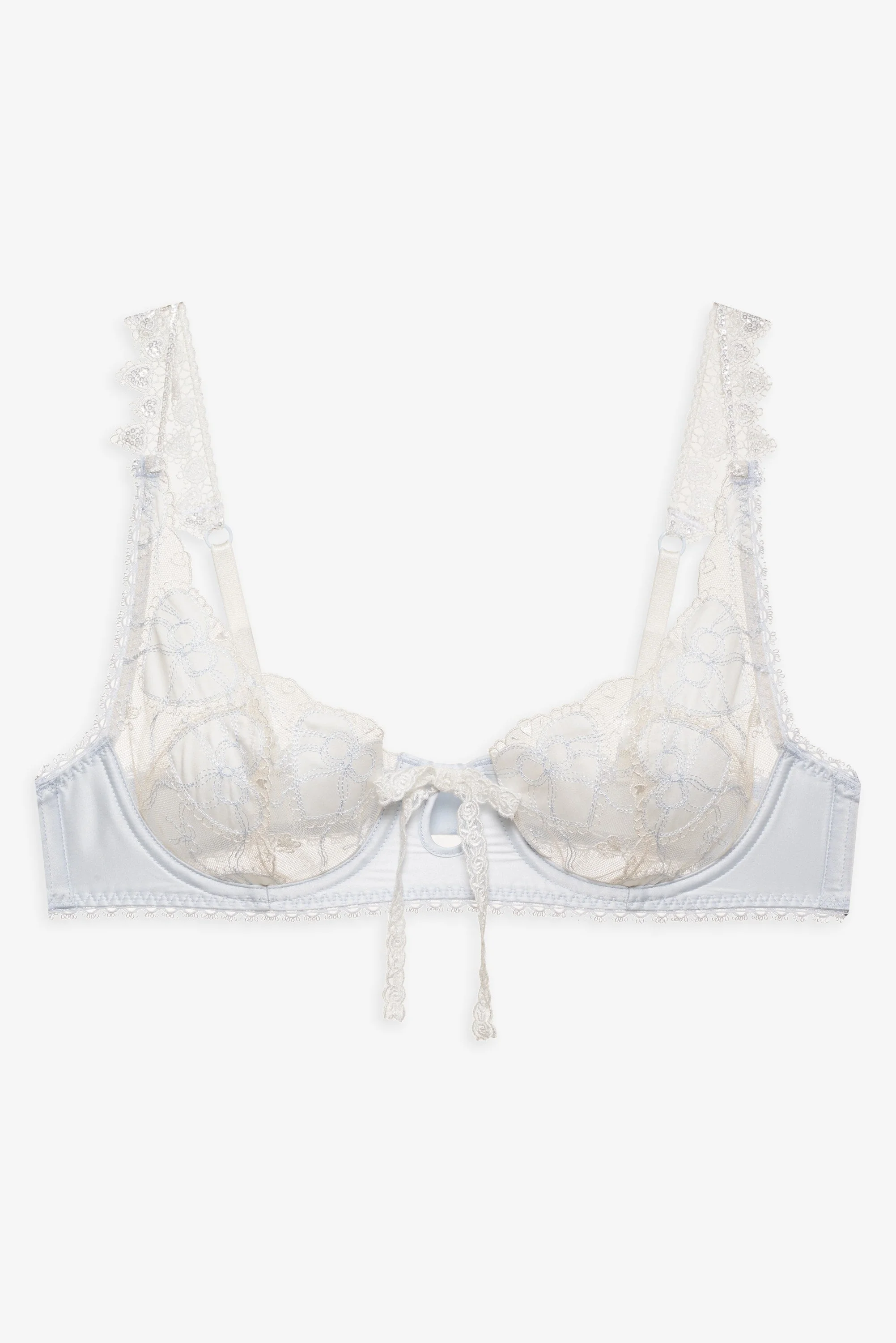 Fall in love with the Pure Heart underwire bra–a blue & white bra crafted in a romantic heart embroidered mesh with a contrast satin frame and wings, and adorned with sequin heart lace trim, a fixed lace bow at the center-front, and picot elastic throughout. Style Notes - Unlined - Adjustable shoulder straps - Hook and eye closure at center-back Fabric + Care - Crafted in 97% polyester, 3% elastane - Lace is made of 100% polyester - Hand wash cold - Do not wring or twist - Line dry - Do not iron - Do not dry clean