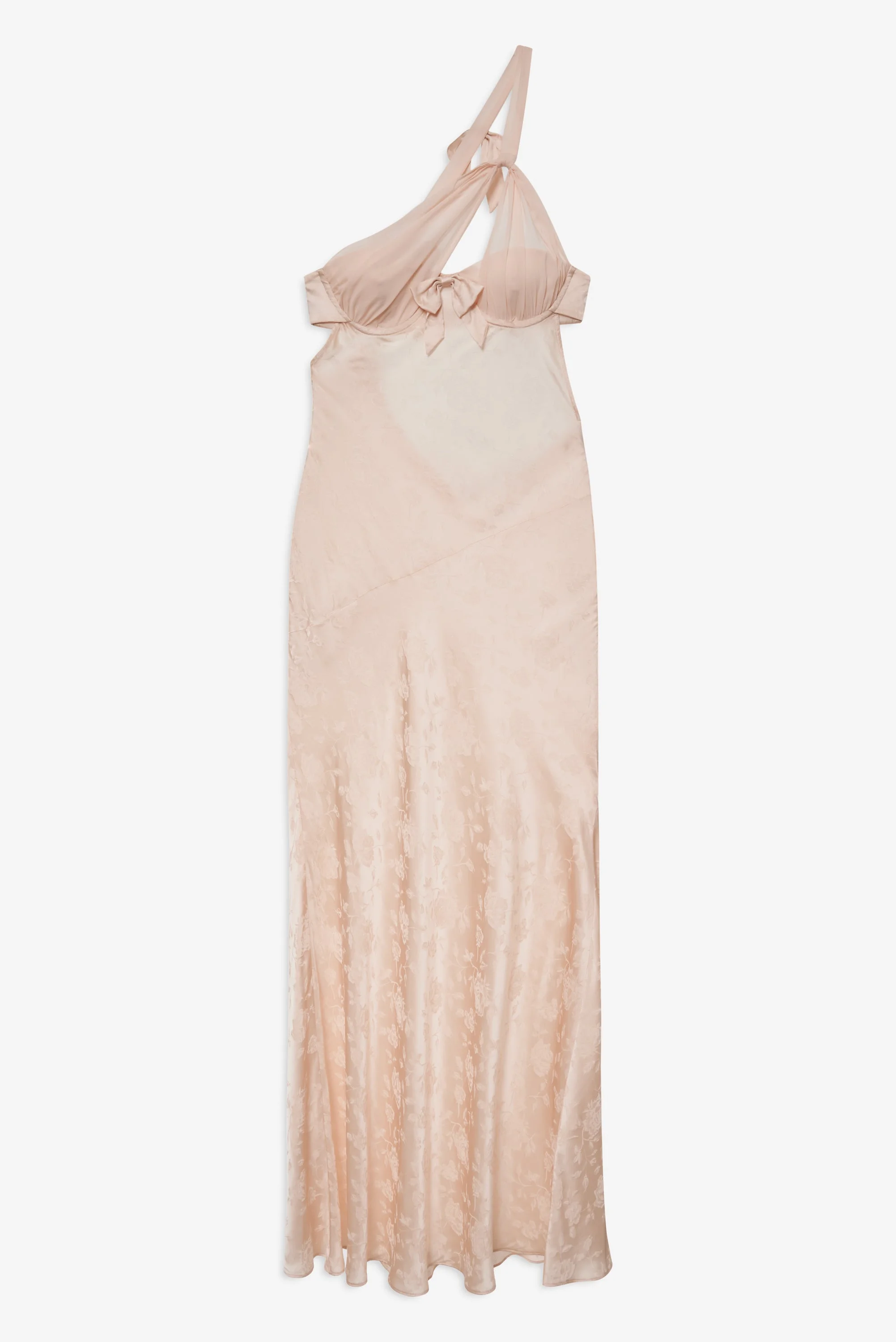 FOR LOVE & LEMONS KEEPSAKES: Designed for the Muse who indulges in romance, the Raspberry Rose silk gown captivates and charms. Crafted in a luxurious floral jacquard, this silk evening gown features an ultra-flattering bias-cut silhouette, a low open-back with bow details throughout, and delicately draped cup overlays for an enchanting look. Style Notes - Skirt is unlined - Functional bra clasp and center-back Fabric + Care - Crafted in 61% silk, 39% viscose - Contrast is made of 92% silk, 8% spandex - Lining is made of 100% polyester - Dry clean only