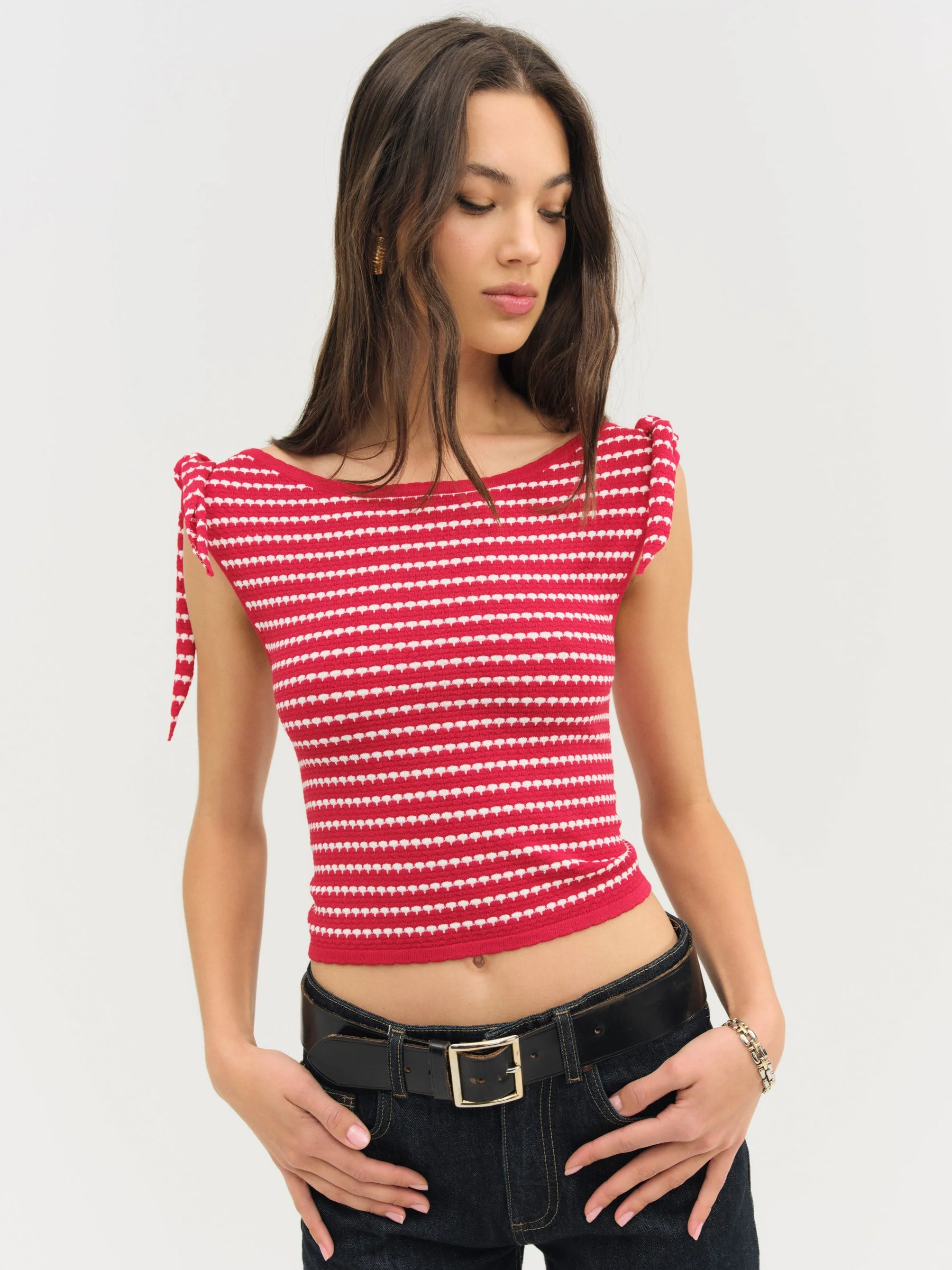 Update your fall closet with the Regatta Stripe knit top—a versatile knitted high neck top with scalloped edges, knotted tie detail at shoulders, and a slightly cropped fit. Fit Notes - True to size Style Notes - Sleeveless Fabric + Care - Crafted in 66% viscose, 34% polyamide - 66% viscose, 34% polyamide - Dry clean only