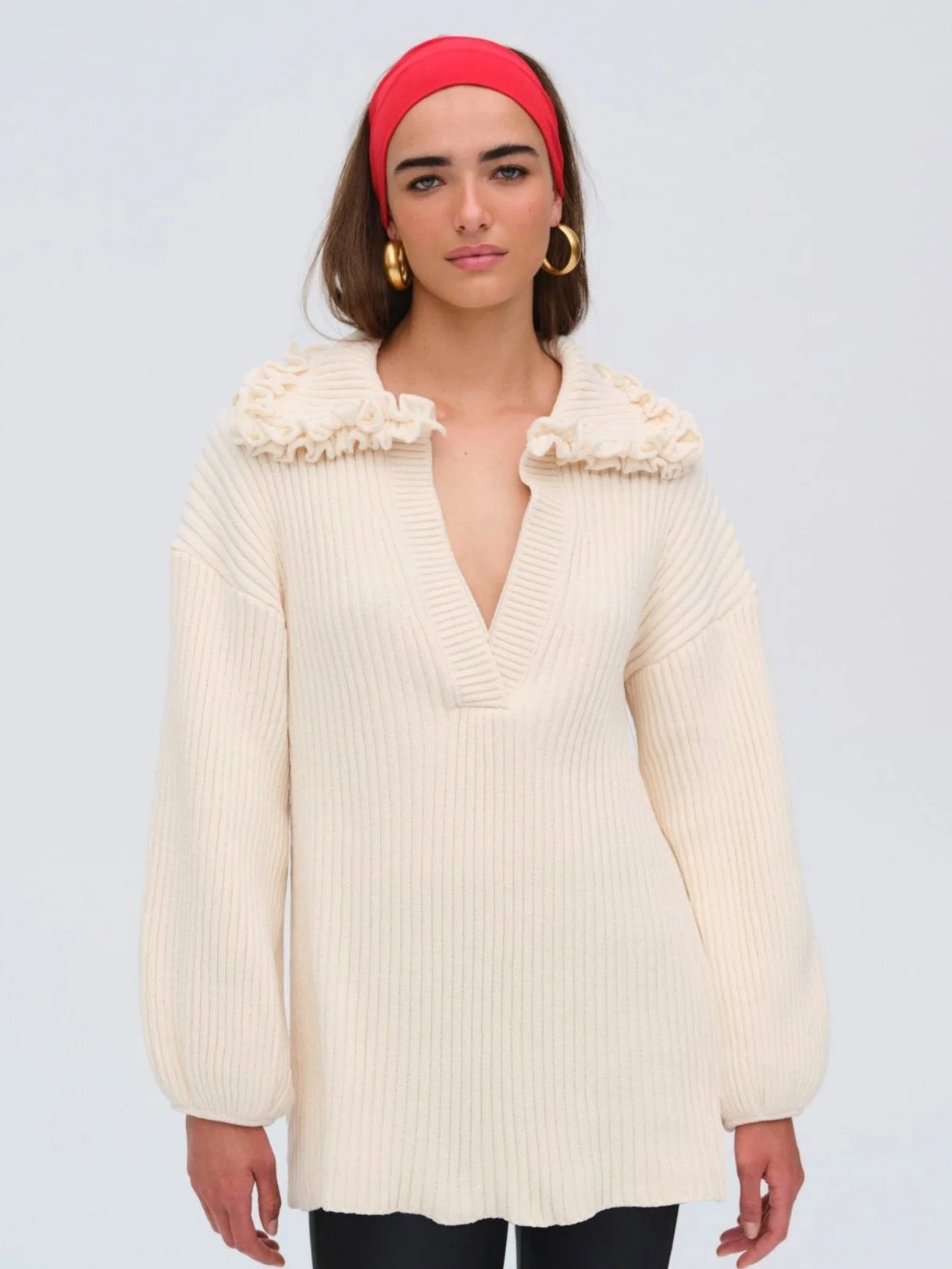Crafted in a chunky chenille rib, this cream mini dress exudes a sense of luxury and effortlessness. Featuring an oversized collar and plunging neckline, this long sleeve knit dress has blouson sleeves and knit ruffles along the collar.