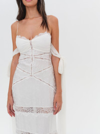 FOR LOVE & LEMONS KEEPSAKES: The Rita ivory lace dress exudes femininity with its off-the-shoulder straps and flattering mermaid silhouette. Crafted in silk jacquard, this luxurious maxi dress features inset lace trims and a crinkle chiffon bust overlay—making it an elegant bridal dress for your chic wedding events. Fit Notes - The Rita Lace Gown is form-fitting through the waist and flares at the hip. - We recommend taking your usual size. Style Notes - Unlined - Lace trims along the bodice and mermaid skirt seams - Adjustable skinny shoulder straps - Open back - Center-back bra clasp and invisible zipper Fabric + Care - Crafted in 100% silk - Eco dry clean is recommended to avoid harmful chemicals like "perc"