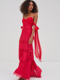 FOR LOVE & LEMONS KEEPSAKES: The Rita red lace dress exudes elegance and femininity with its off-the-shoulder straps and flattering mermaid silhouette. Crafted in silk jacquard, this luxurious evening gown features inset lace trims and a crinkle chiffon bust overlay—making it an ultra-chic option for a wedding guest gown or holiday party dress. Fit Notes - The Rita Lace Gown is form-fitting through the waist and flares at the hip. - We recommend taking your usual size. Style Notes - Unlined - Lace trims along the bodice and mermaid skirt seams - Adjustable skinny shoulder straps - Open back - Center-back bra clasp and invisible zipper Fabric + Care - Crafted in 100% silk - Contrast is made of 100% silk - Dry clean only