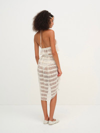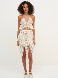 Get into the festival spirit with the Romy Bralette halter top—a ruffled crop top with triangle cups and a flirty peplum ruffle along the underbust. Designed for slow desert days, this sheer top showcases functional ties at the halter neckline and the bust for an easy silhouette. Style Notes - Unlined - Elasticized ruffle at back neck Fabric + Care - Crafted in 95% polyester, 5% elastane - Hand Wash Cold - Do Not Wring Or Twist - Line Dry - Do Not Iron - Do Not Dry Clean