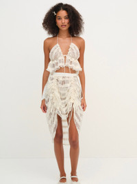 Get into the festival spirit with the Romy slip skirt–a high-waisted sheer skirt adorned with contrast satin ties at the side seams. Designed for slow desert days, this white midi skirt features ruffles and functional drawstring ties at the front princess points for adjustable length. Style Notes - Unlined Fabric + Care - Crafted in 95% polyester, 5% elastane - Waistband is made of 60% polyester, 33% recycled polyester, 7% elastane - Hand Wash Cold - Only Non-Chlorine Bleach - Do Not Wring Or Twist - Line Dry - Do Not Iron - Do Not Dry Clean