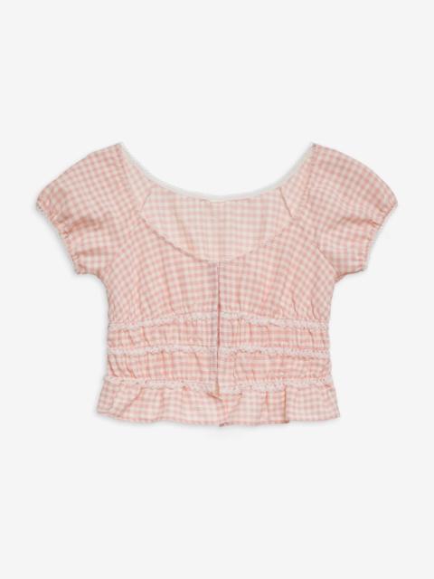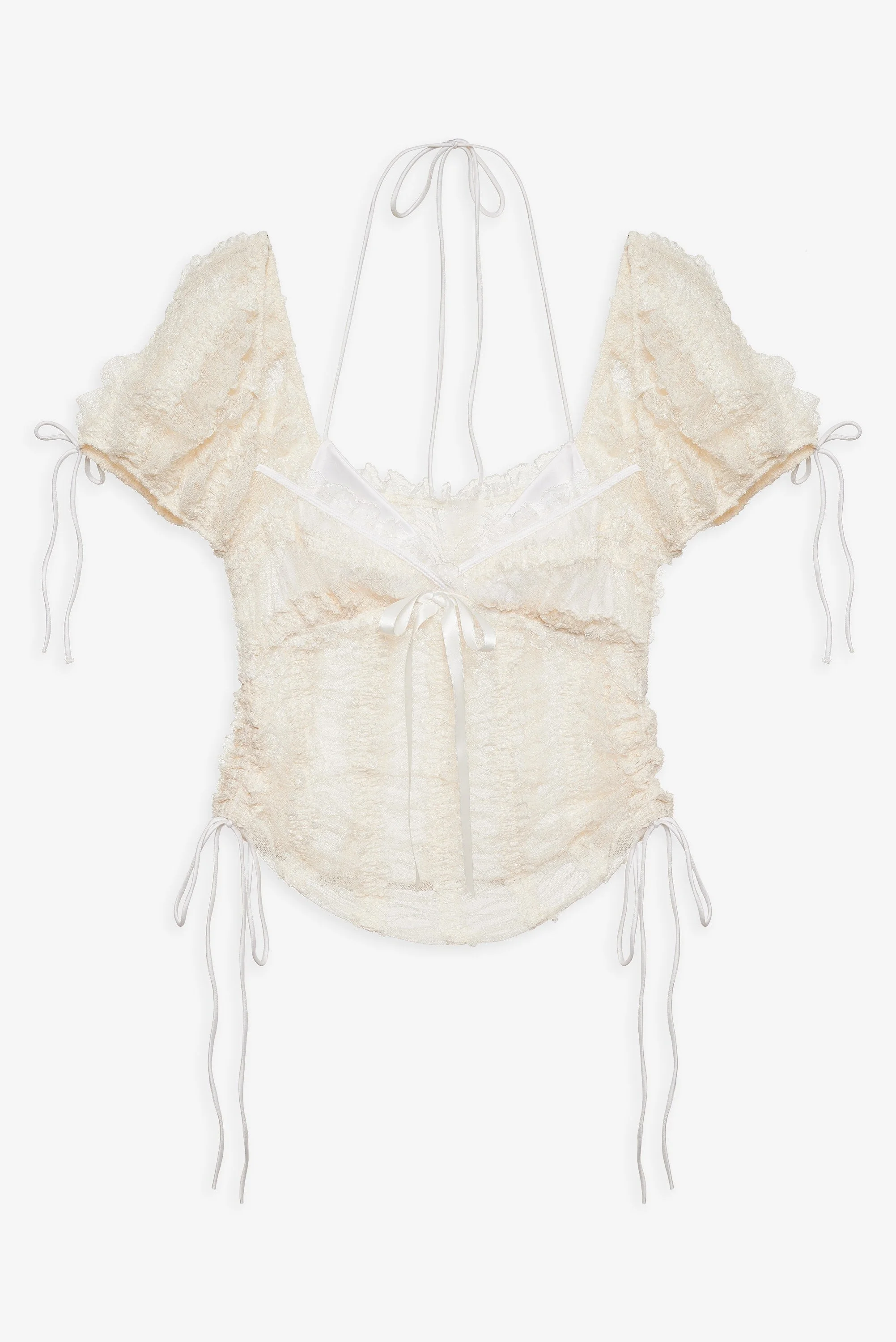 Get into the festival spirit with the Romy sheer blouse–a ruffled crop top with an exposed triangle cup lining and halter tying straps. Designed for slow desert days, this puff sleeve top is adorned with intricate lace trims and decorative bows throughout. Style Notes - Cups are lined - Elasticized neckline and underbust - Functional drawstring ties at side seams Fabric + Care - Crafted in 95% polyester, 5% elastane - Ruffles are made of 100% polyamide - Cup lining is made of 60% polyester, 33% recycled polyester, 7% elastane - Hand Wash Cold - Only Non-Chlorine Bleach - Do Not Wring Or Twist - Line Dry - Do Not Iron - Do Not Dry Clean