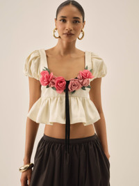 Become the belle of the ball in the Rosalie cream top—a satin peplum top with beautiful hand-crafted rose embellishments along the neckline. This puff sleeve top is adorned with a single black velvet bow at the under-bust. Fit Notes - True to size Style Notes - Bust and sleeves lined - Functional center-back keyhole with button closure - Each rosette is made lovingly by hand and may vary in size and shape Fabric + Care - Crafted in 100% polyester - Dry Clean Only
