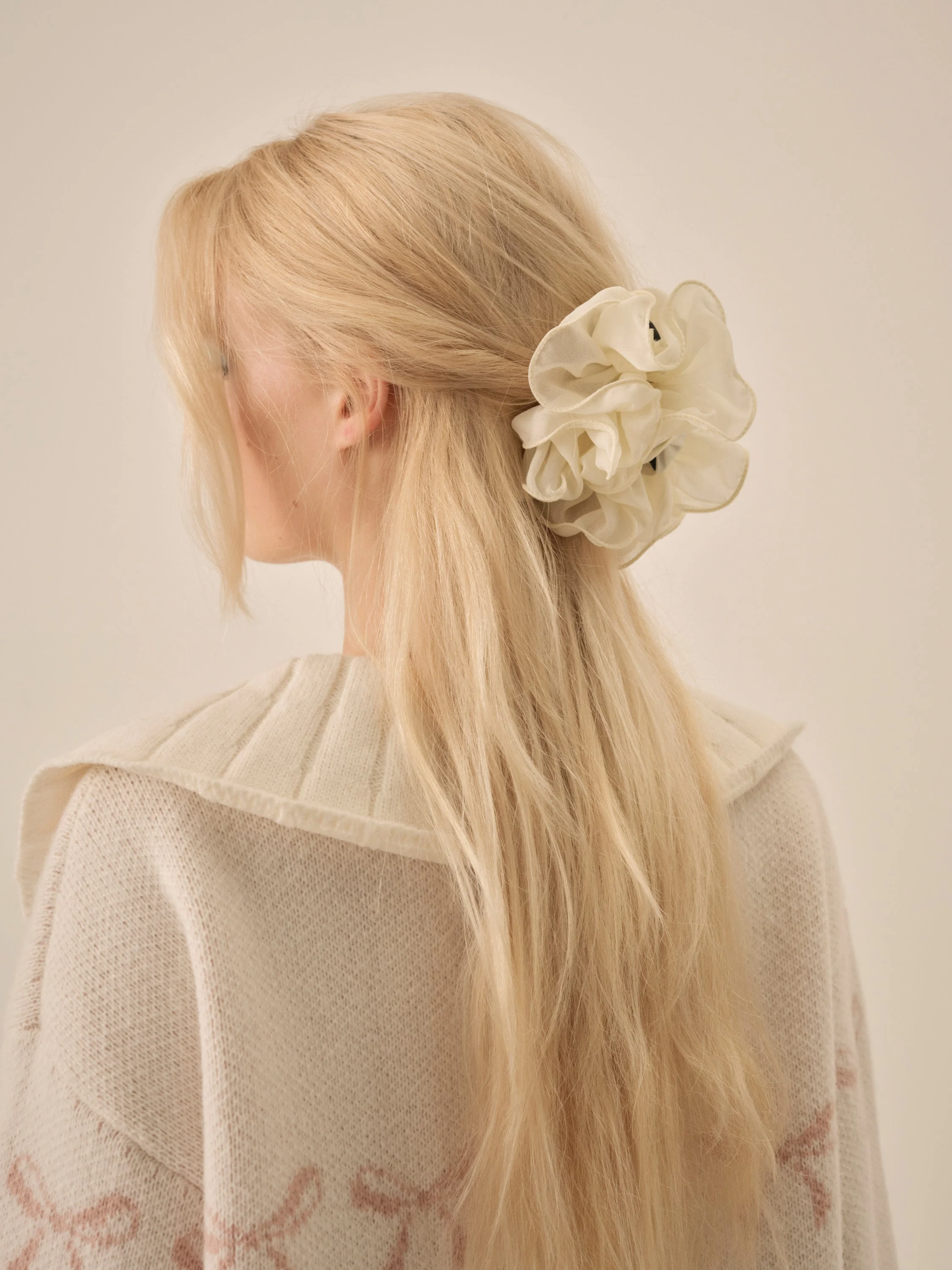 Add elegance to your accessories rotation with this cream rosette claw clip. Layered ribbon petals form a voluminous rose that hides the hair clip beneath, giving your hairstyle a refined, feminine edge. Fabric + Care - Plastic/acrylic claw clip back - Fabric ribbon rosette