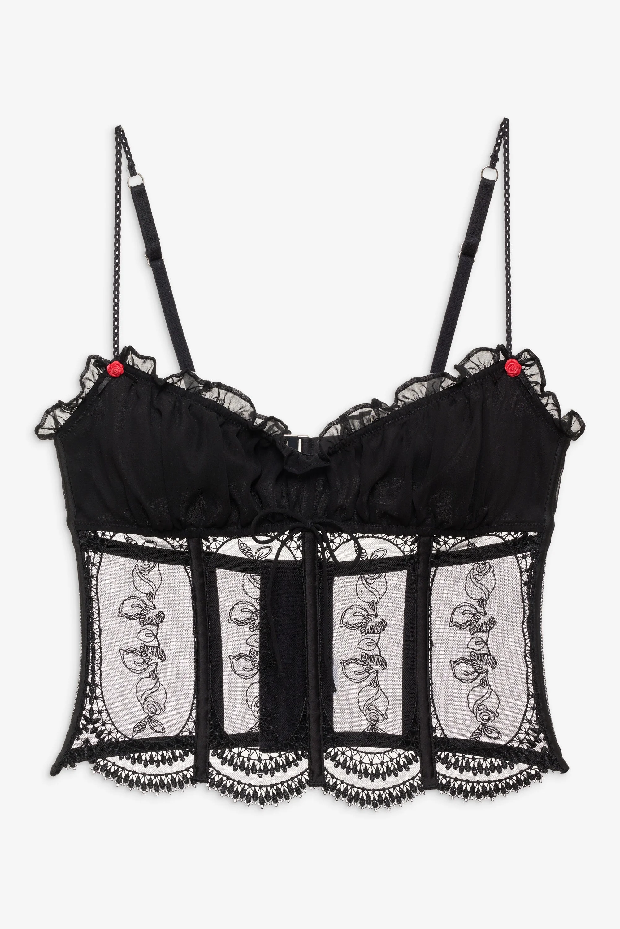 The Roxanne black bustier is your something naughty and something nice. Crafted in rose-embroidered mesh, this bustier top features ruched chiffon at the bust and scalloped lace along the hem. It's adorned with decorative skinny rows and sweet rosettes.
