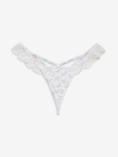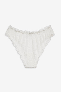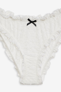 Made for barefoot walks in the grass, the Sally white lace panty is for the effortless beauty. Crafted in an intricate floral stretch lace, this lace underwear features a full coverage back and is adorned with ruffled trims and a center-front contrast decorative bow. Style Notes - Unlined - Elasticated leg opening and waist Fabric + Care - Crafted in 98% polyamide, 2% elastane - Gusset is made of 100% modal - Hand wash cold - Only non-chlorine bleach - Do not wring or twist - Line dry - Do not iron - Do not dry clean