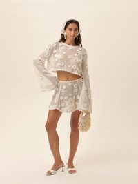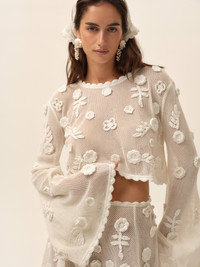 A cotton crochet top at home in spring gardens and seaside air, this bell-sleeve crop top style features custom floral appliques and playful scalloped edges. Complete the look with the Style Notes - Floral appliques - Scalloped neckline, sleeves, and hem - Bell sleeves - Cropped body - Unlined Fabric + Care - Crafted in 100% cotton - Contrast is made of 100% cotton - Dry clean only