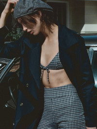 The Savannah bra top is a chic layering staple for fall. Crafted in a chic check suiting fabric, this triangle bralette spotlights feminine scrunchie shoulder straps and a fixed bow at the front. Style Notes - Fully lined - Adjustable shoulder straps - Enamel swan hook center-back closure with 3 loops Fabric + Care - Crafted in 68% polyester, 30% rayon, 2% spandex - Lining is made of 100% polyester - Hand wash - Air dry - Do not bleach - Do not iron