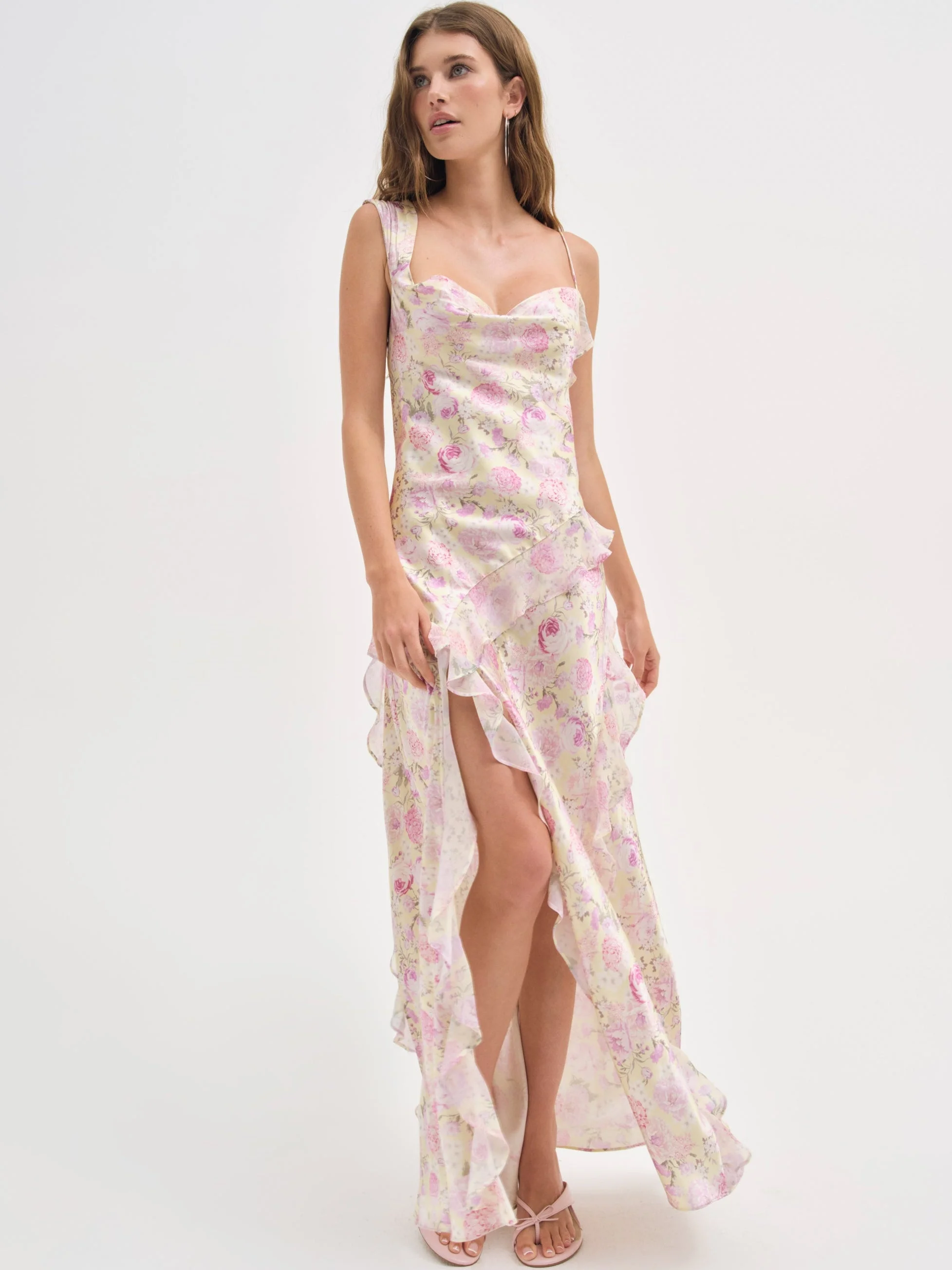 Get RSVP-ready in the Sawyer butter yellow maxi dress—a satin bias cut dress featuring an asymmetrical draped cowl neckline, a thigh-high slit, and chiffon ruffles throughout. Style Notes - Unlined - Invisible zipper at the left side seam Fabric + Care - Crafted in 53% ecovero™ viscose, 47% viscose - Contrast is made of 100% recycled polyester - Dry clean only