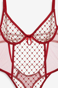 A sheer bodysuit built for your boldest moments, complete with scarlet heart embroidery, glitter elastics, and a sheer finish. Complete the look with the Scarlet Bralette. Style Notes - Scarlet embroidery & power mesh - Underwire cups - Thong panty coverage - Open back - Glitter elastics - Adjustable shoulder straps - Hook-and-eye closure - Gusset lining only Fabric + Care - Crafted in 100% polyamide - Side is made of 100% polyamide - Center-back is made of 87% polyamide, 13% elastane - Lining is made of 100% polyester - Gusset is made of 100% viscose - Hand wash cold - Only non-chlorine bleach - Do not wring or twist - Line dry - Do not iron - Do not dry clean