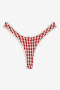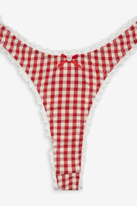 Made for farmer’s market mornings, the Scotch Bonnet red gingham panty exudes summer charm. Crafted in a nostalgic textured gingham, this thong panty is adorned with delicate lace trims and a decorative bow and button detail at the center-front. Style Notes - Unlined - V-shape thong - Elasticated leg opening and waist Fabric + Care - Crafted in 98% polyester, 2% elastane - Gusset is made of 100% viscose - Hand wash cold - Only non-chlorine bleach - Do not wring or twist - Line dry - Do not iron - Do not dry clean