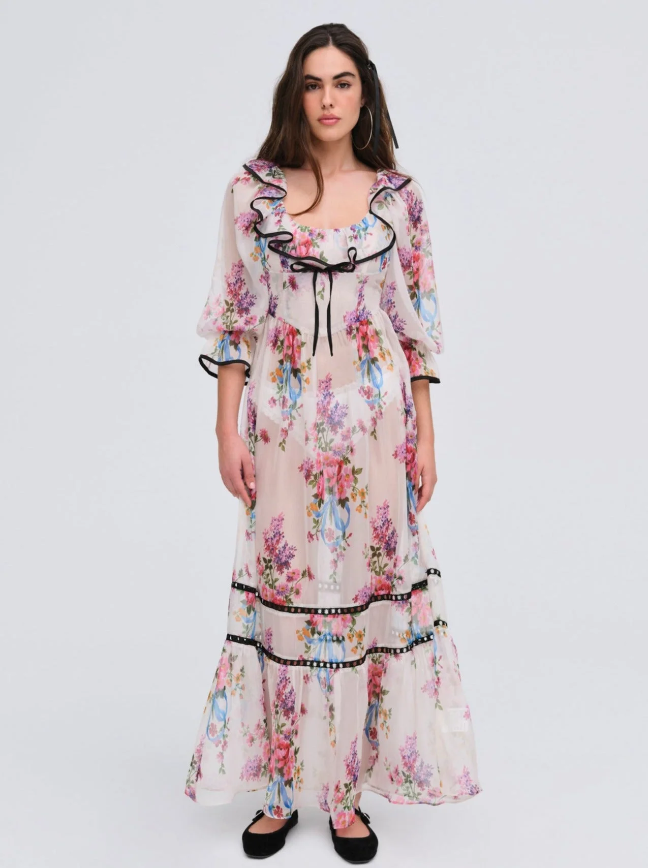 A spectacle of elegance and whimsicality, the Severine multicolor maxi dress takes references from to vintage floral dresses. This long sleeve dress showcases ribbon bouquets printed on organza—it has an elasticized ruffled neckline, contrast velvet trims, and dramatic ruffled puff sleeves. Fit NotesThe Severine Maxi Dress is designed for a loose fit. We suggest taking your usual size. Style Notes - Separate white slip lining included - Adjustable straps on slip dress - Drop waistline with functional velvet tie - Both pieces must be included if returned* Fabric + Care - Crafted in 100% polyester - Lining is made of 97% recycled polyester, 3% spandex - Eco dry clean recommended